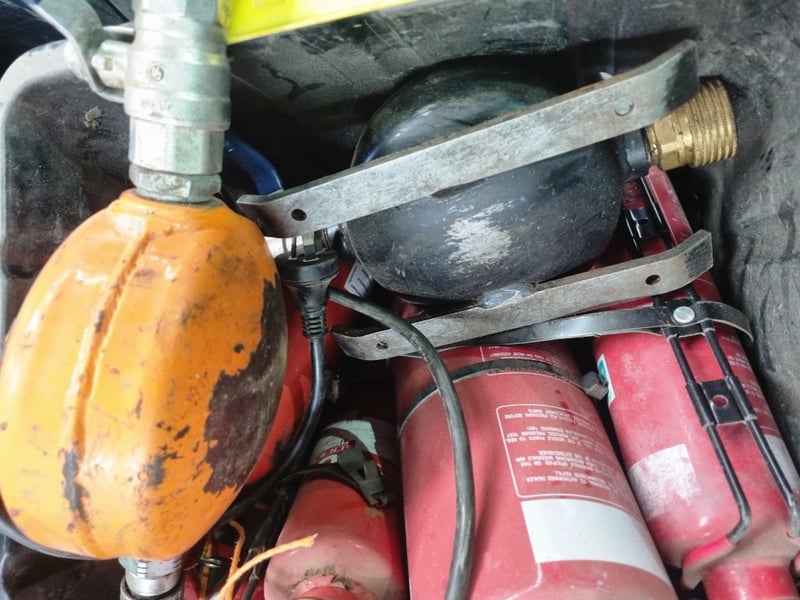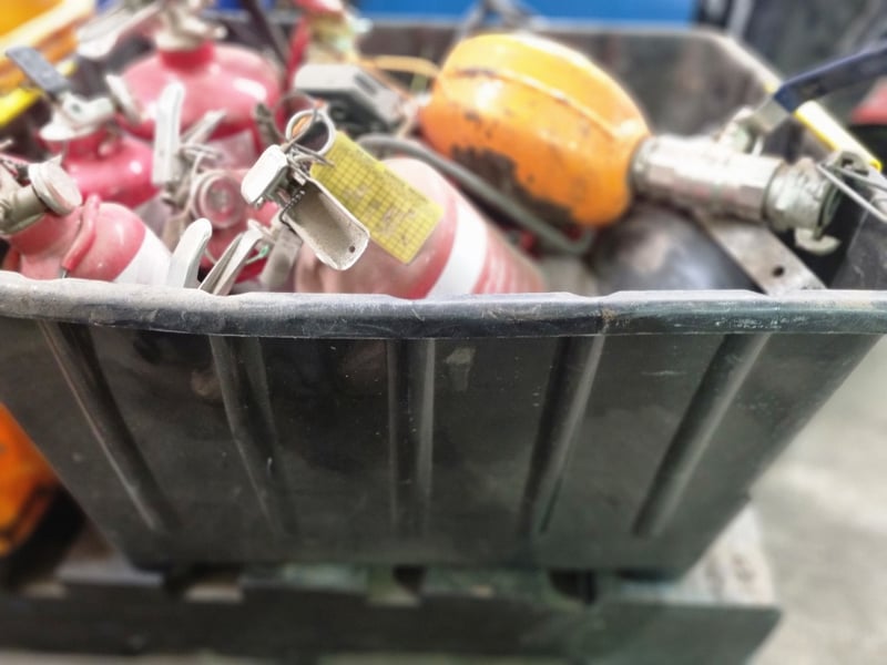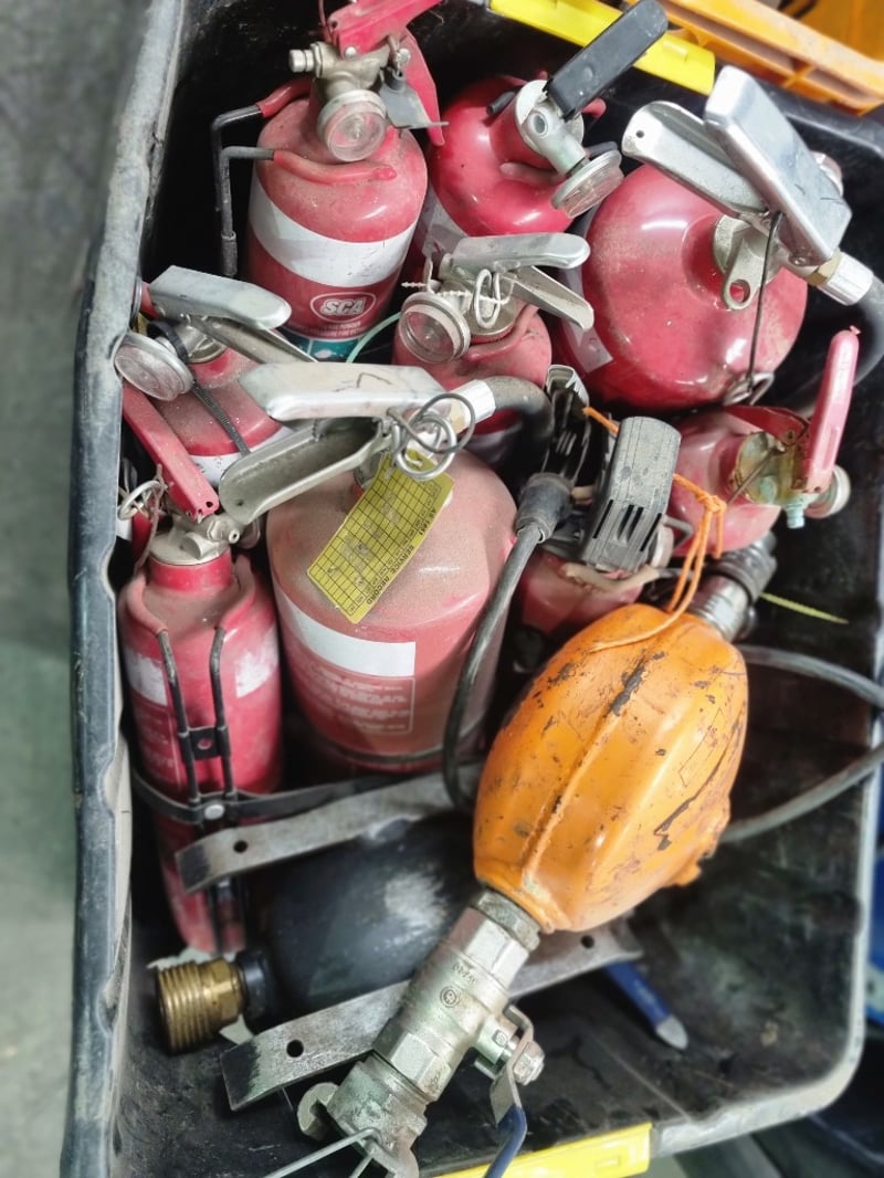 Comprehensive fire safety equipment collection contained in black polymer storage crate. Collection includes pressurized fire extinguishers in red steel cylinders with white band labels and brass valve assemblies, ranging from standard to compact sizes.