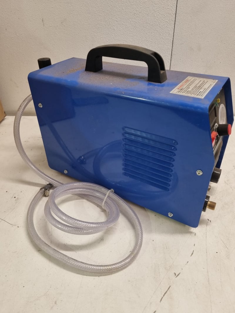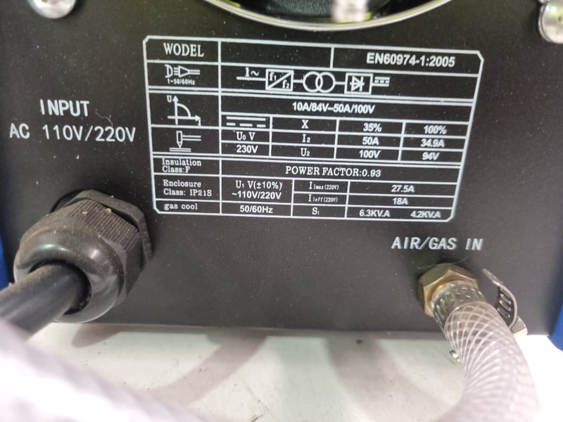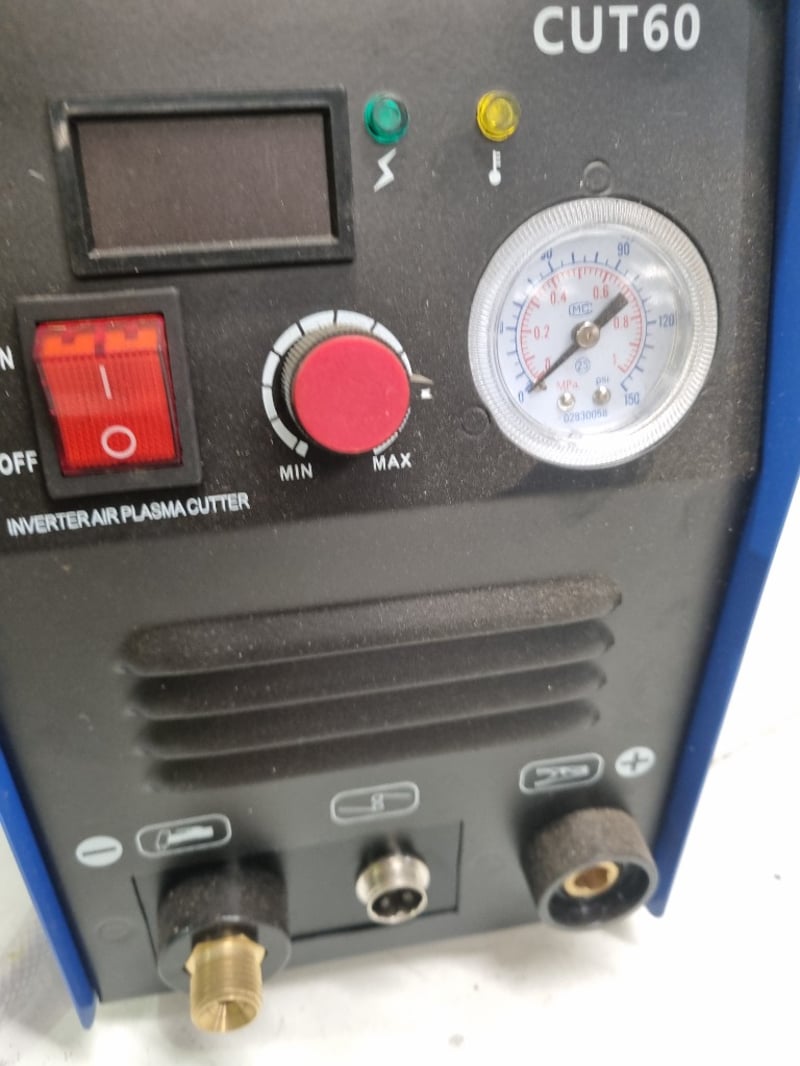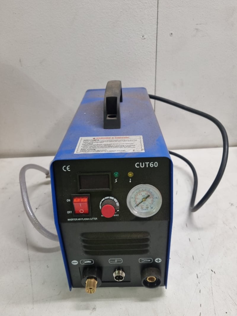 CUT60 Inverter Air Plasma Cutter - Professional grade cutting equipment featuring 60A capacity at 100% duty cycle. WODEL branded unit with dual voltage input (110V/220V AC, 50/60Hz). Compact portable design in blue metal housing with integrated carrying handle. Control panel includes ON/OFF switch, MIN/MAX adjustment knob, and dual-gauge pressure monitoring system (green and yellow indicator lights). Equipped with torch head assembly, clear vinyl air/gas inlet hoses, and brass connection fittings. Pressure gauge displays 0-160 PSI range. Unit rated at 6.3KVA (4.2KVA at 220V), with maximum cutting capacity up to 25.4A at full power.