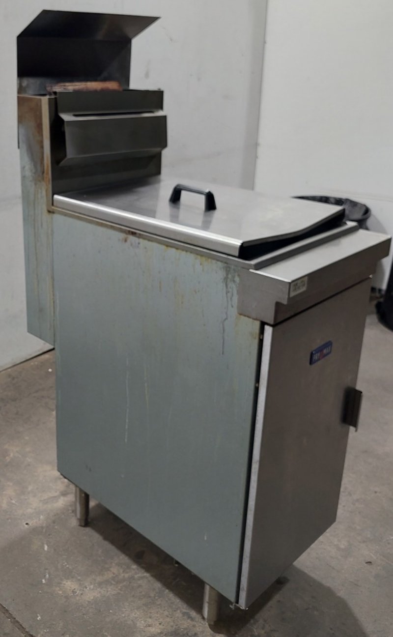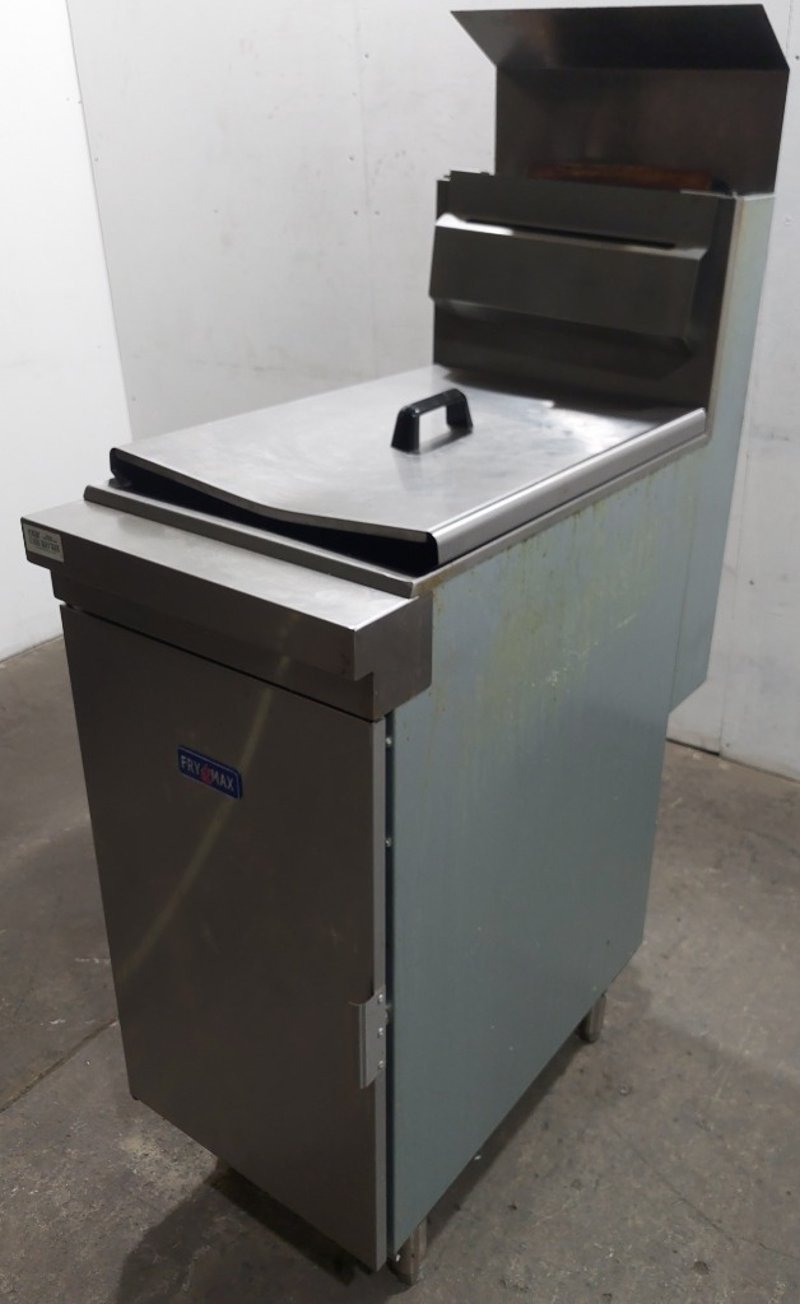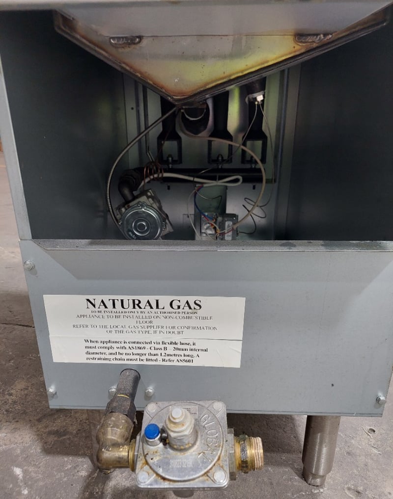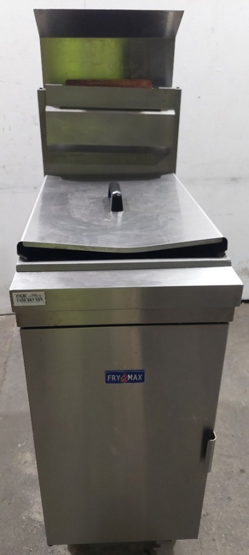 FryMax commercial deep fryer unit, model RC300E, manufactured by FED and distributed by Burkett Hospitality Equipment Sydney. Gas-fired fryer designed for professional kitchen use with natural gas (NG) or ULPG capability. Features stainless steel construction with integrated frying vessel and removable basket system. Equipment includes overhead exhaust hood with black metal canopy, control panel with temperature regulation dial, and metal drip tray with handles. Internal components visible include four heating tubes with red safety lever, mesh filtration basket, and burner assembly mounted on non-combustible base. Comes equipped with flexible gas hose connections compliant with AS1869 Class B specifications and pressure regulator. Certification number GMK10174 noted on nameplate. Serial number R2308032450. Suitable for high-volume commercial frying operations. Shows signs of heavy use with minor oxidation and wear consistent with kitchen equipment age.Dims: 137cm H, 77cm W, 39cm D.Note : Sold as is, untested, no refunds. Inspect before bidding.
