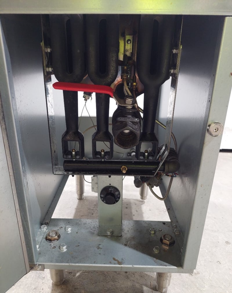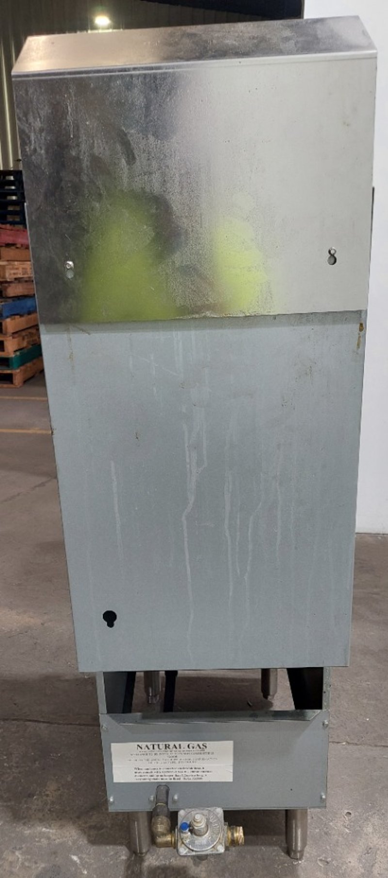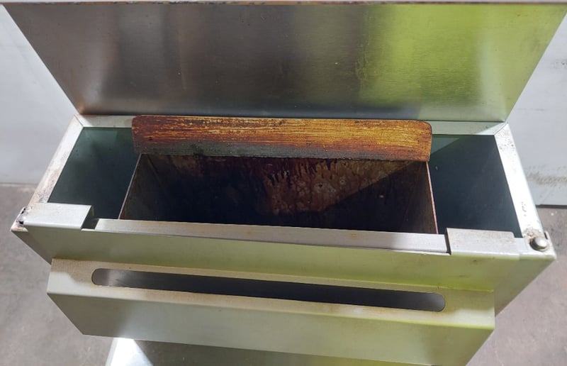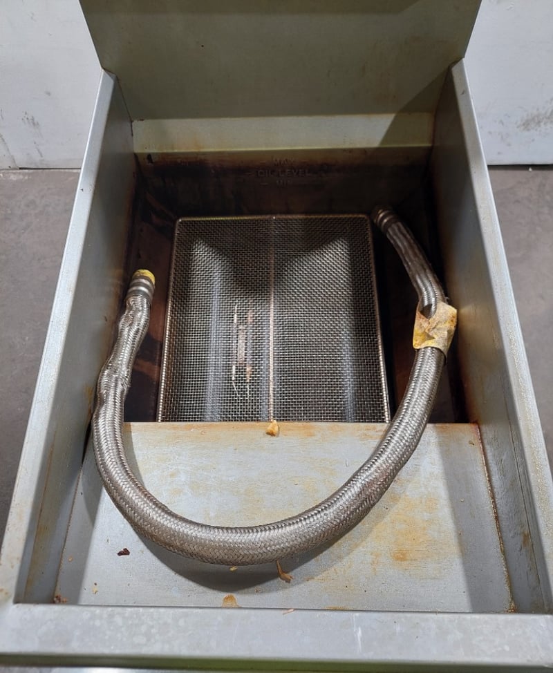 FryMax commercial deep fryer unit, model RC300E, manufactured by FED and distributed by Burkett Hospitality Equipment Sydney. Gas-fired fryer designed for professional kitchen use with natural gas (NG) or ULPG capability. Features stainless steel construction with integrated frying vessel and removable basket system. Equipment includes overhead exhaust hood with black metal canopy, control panel with temperature regulation dial, and metal drip tray with handles. Internal components visible include four heating tubes with red safety lever, mesh filtration basket, and burner assembly mounted on non-combustible base. Comes equipped with flexible gas hose connections compliant with AS1869 Class B specifications and pressure regulator. Certification number GMK10174 noted on nameplate. Serial number R2308032450. Suitable for high-volume commercial frying operations. Shows signs of heavy use with minor oxidation and wear consistent with kitchen equipment age.Dims: 137cm H, 77cm W, 39cm D.Note : Sold as is, untested, no refunds. Inspect before bidding.