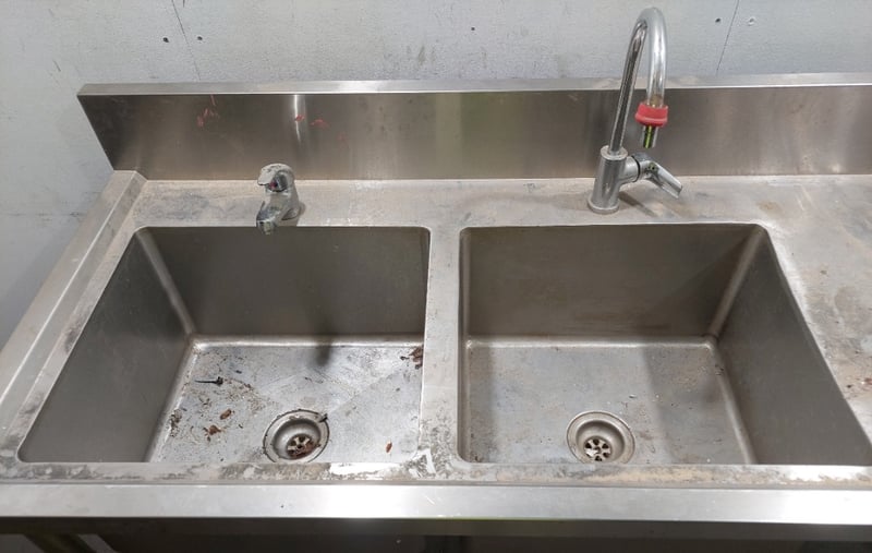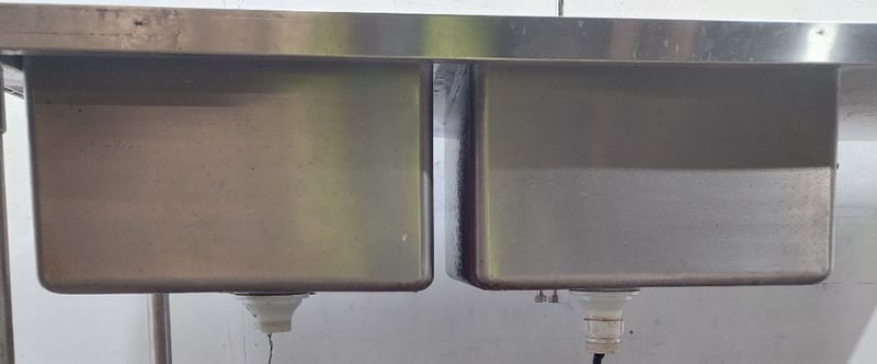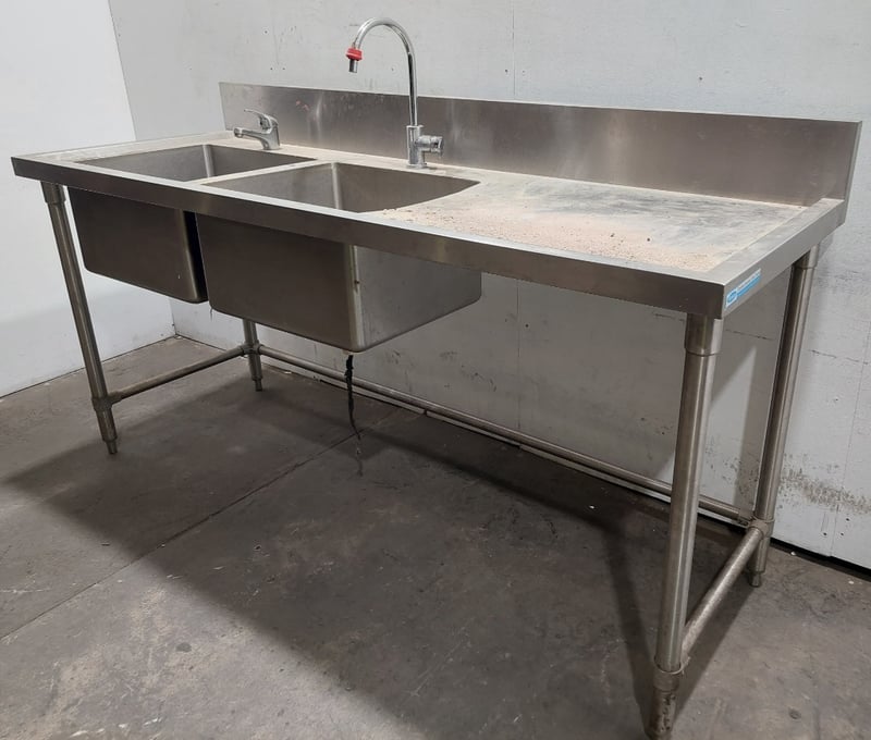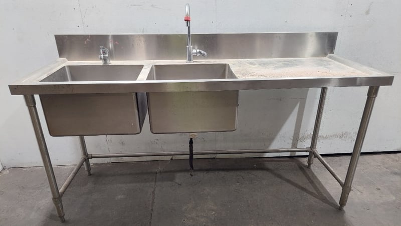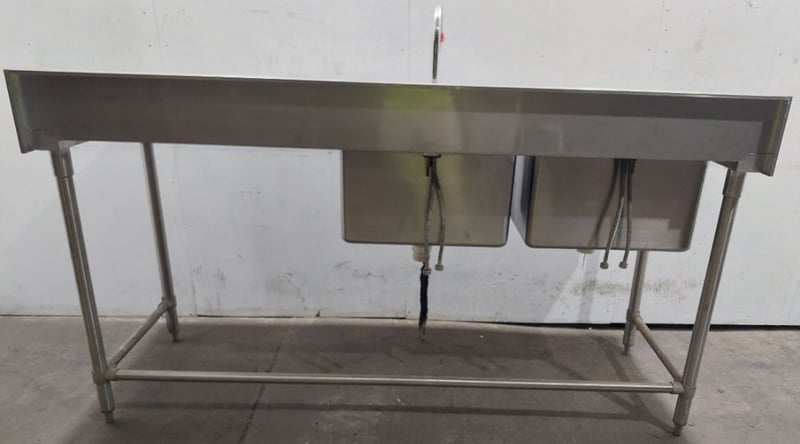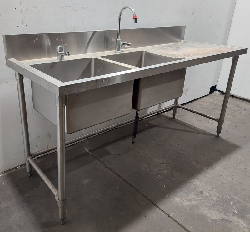 Professional-grade commercial double sink unit featuring two deep stainless steel bowls with integrated drainboards. The unit includes dual mixer taps with pull-down spray heads and red aerators. Constructed from brushed stainless steel throughout with a robust welded frame. Features include splashback, work surfaces on both sides of the sinks, and sturdy tubular steel legs with foot bracing.