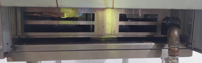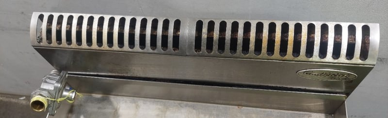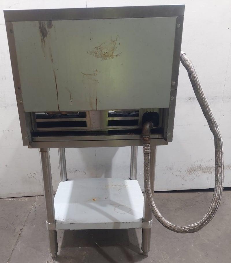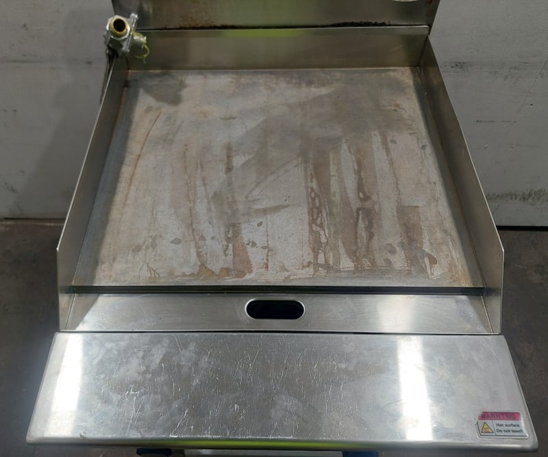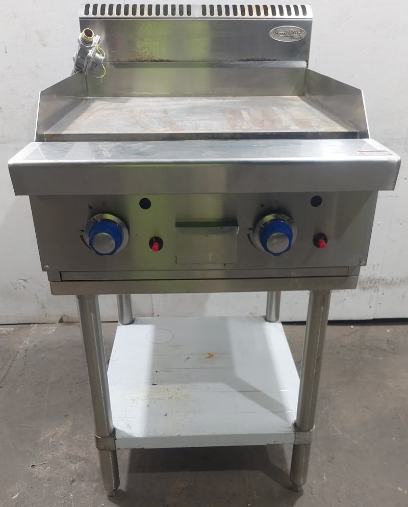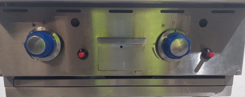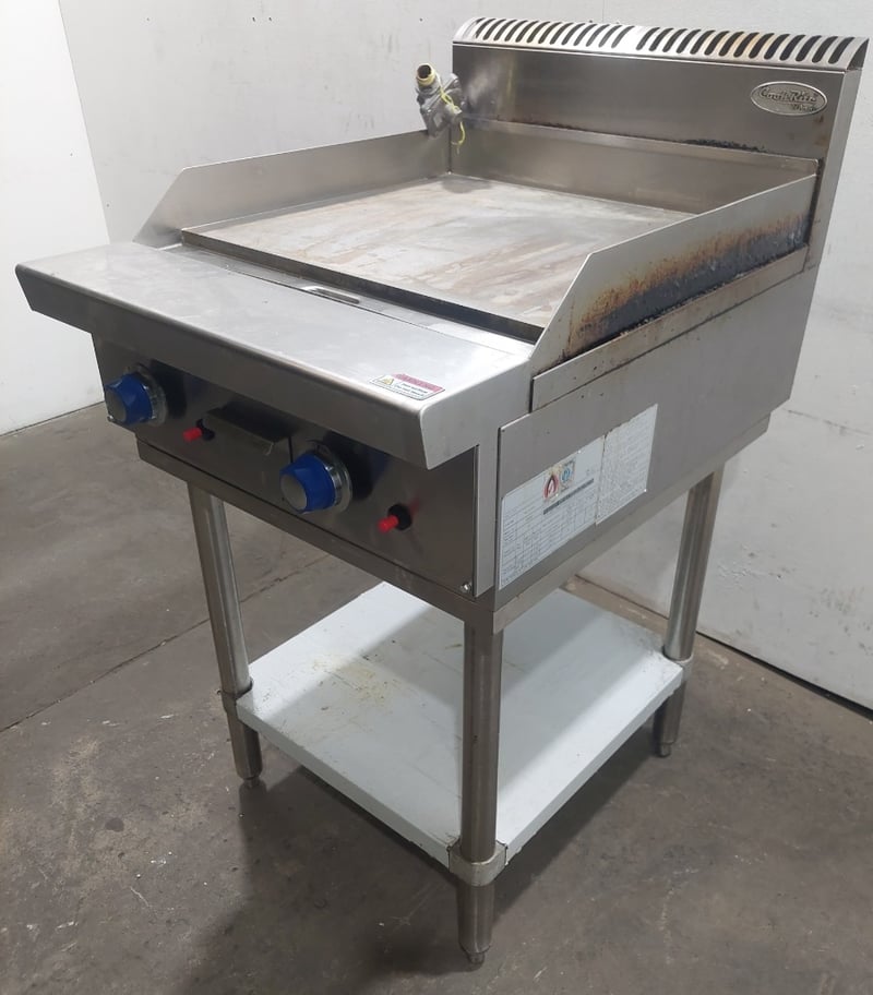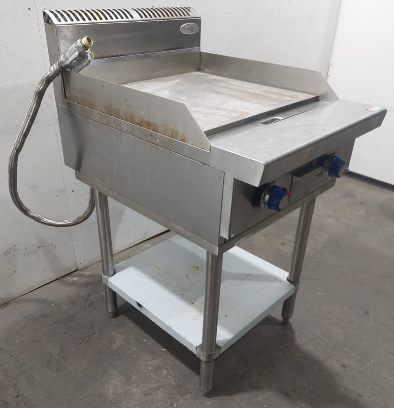 Atosa commercial gas griddle, Model NT800G-C, stainless steel construction with two independent burners equipped with blue control knobs and red safety indicators. Features a large flat cooking surface approximately 800mm wide, front grease trap with removable drip tray, and rear splashback with ventilation slots. Mounted on a white powder-coated steel stand with lower shelf. Gas connection via flexible hose with brass fitting. Includes original manufacturer's plate indicating propane/LPG capability, Australian/New Zealand gas safety certification, and Oceana GasMark compliance. Some surface oxidation and minor wear visible on cooking surface and stand.