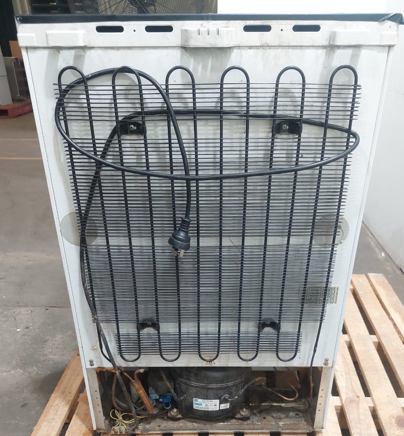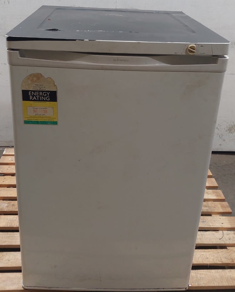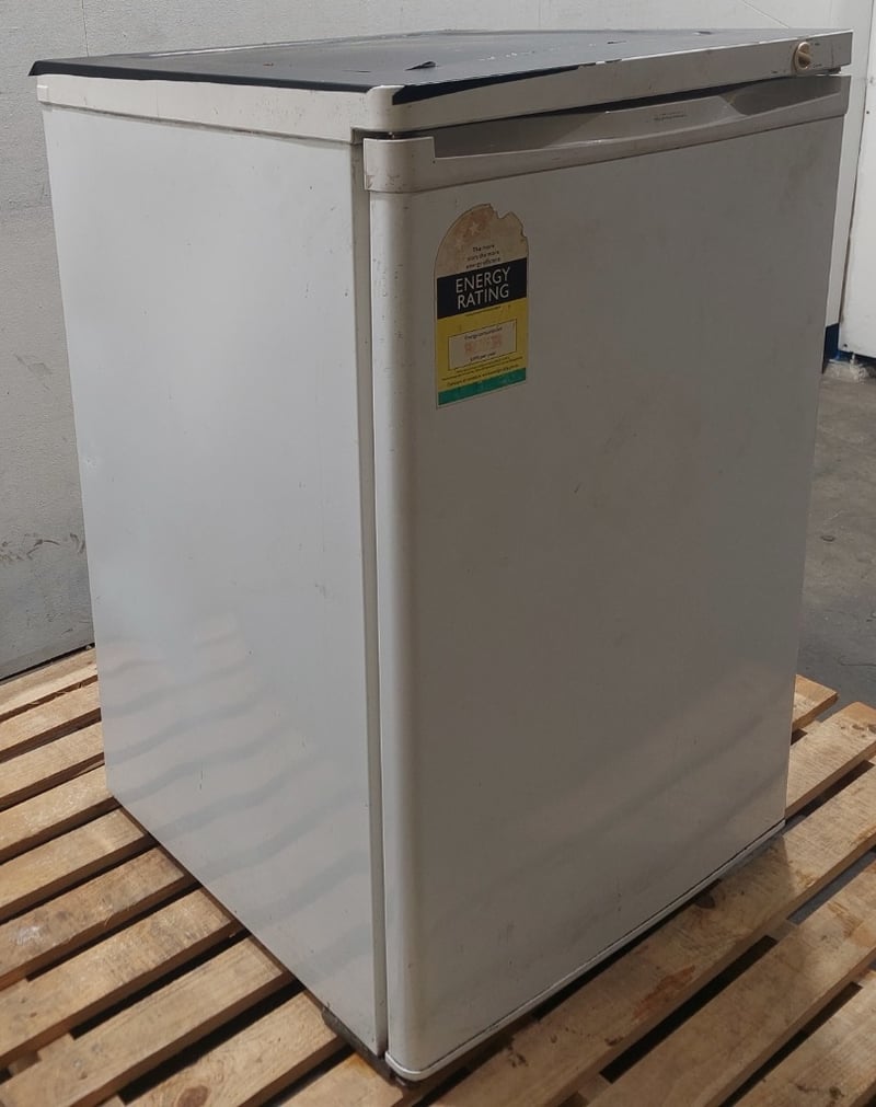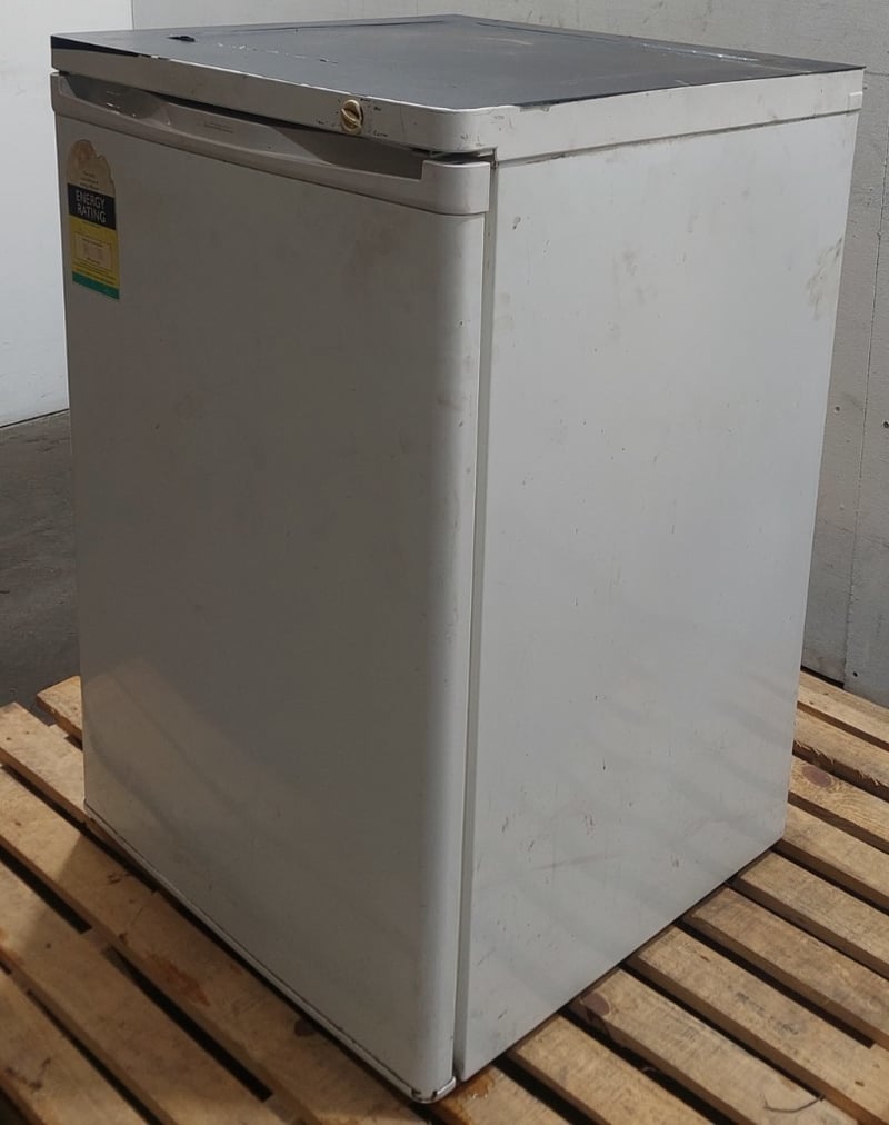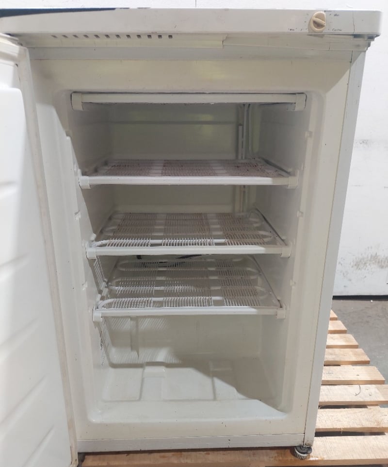 Electrolux FR91T upright freezer, 75L storage capacity. White finish with grey top panel. Features manual defrost system, adjustable shelving with wire baskets, and thermostat control. Model FR91T, Serial No. 72600025.