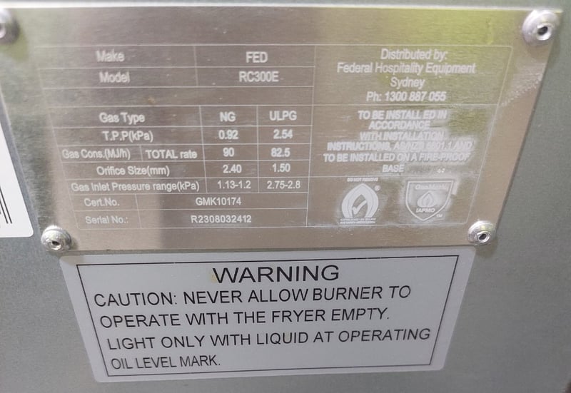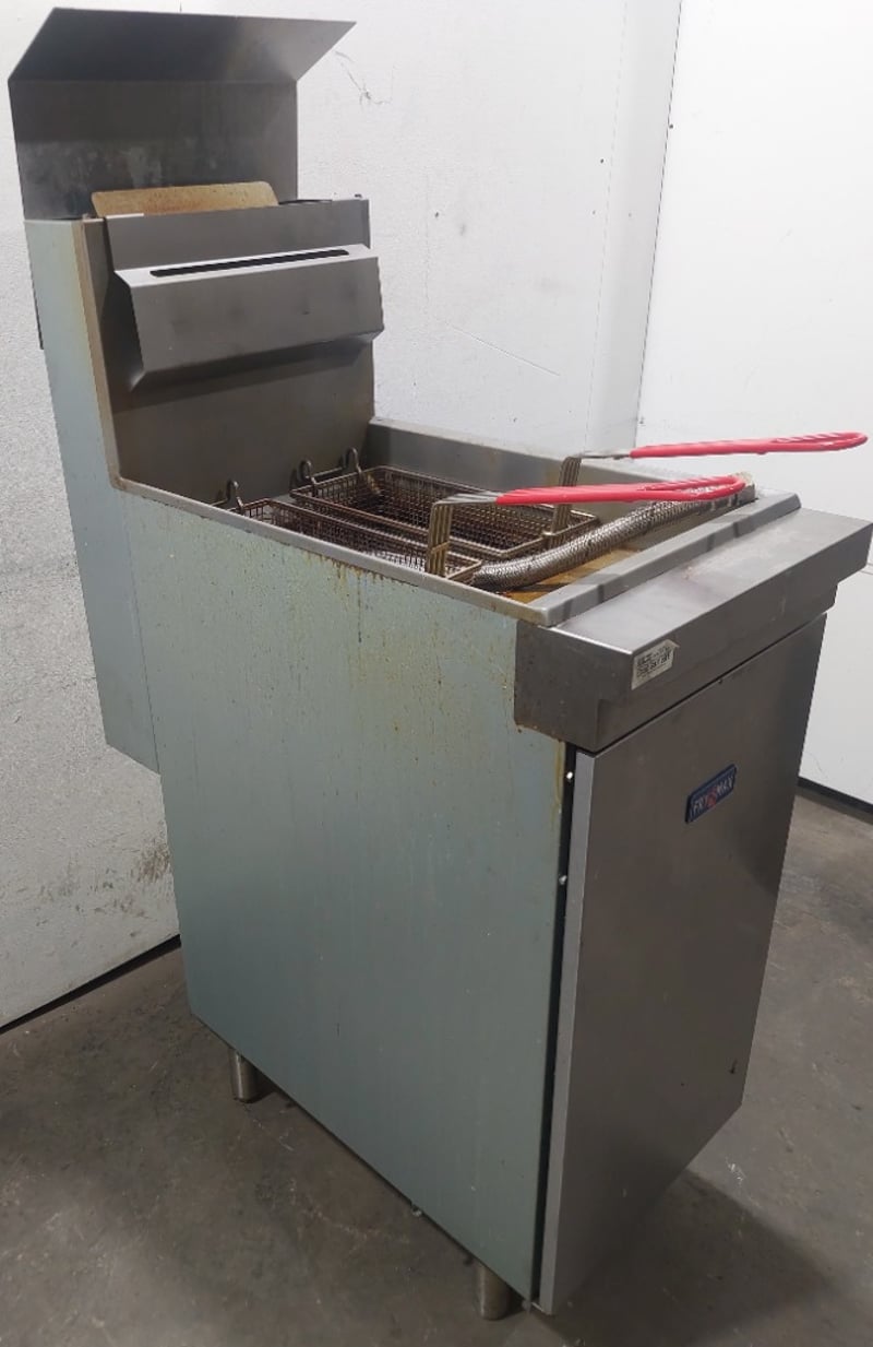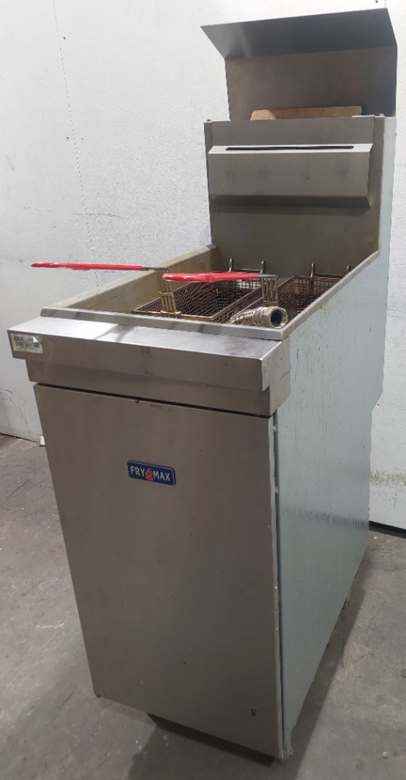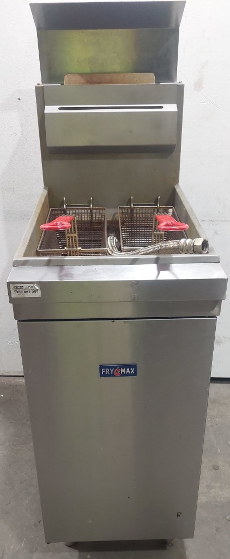 Commercial-grade natural gas deep fryer by FRY-O-MAX, Model RC300E, distributed by Federal Hospitality Equipment Sydney. Features dual stainless steel baskets with red handles, twin frying chambers with independent temperature control. Equipped with piloted gas burner system (visible drain valve labeled), thermostat control dial, and stainless steel construction throughout.Dims: 136cm H, 40cm W, 77cm D.Note: Sold as is , untested