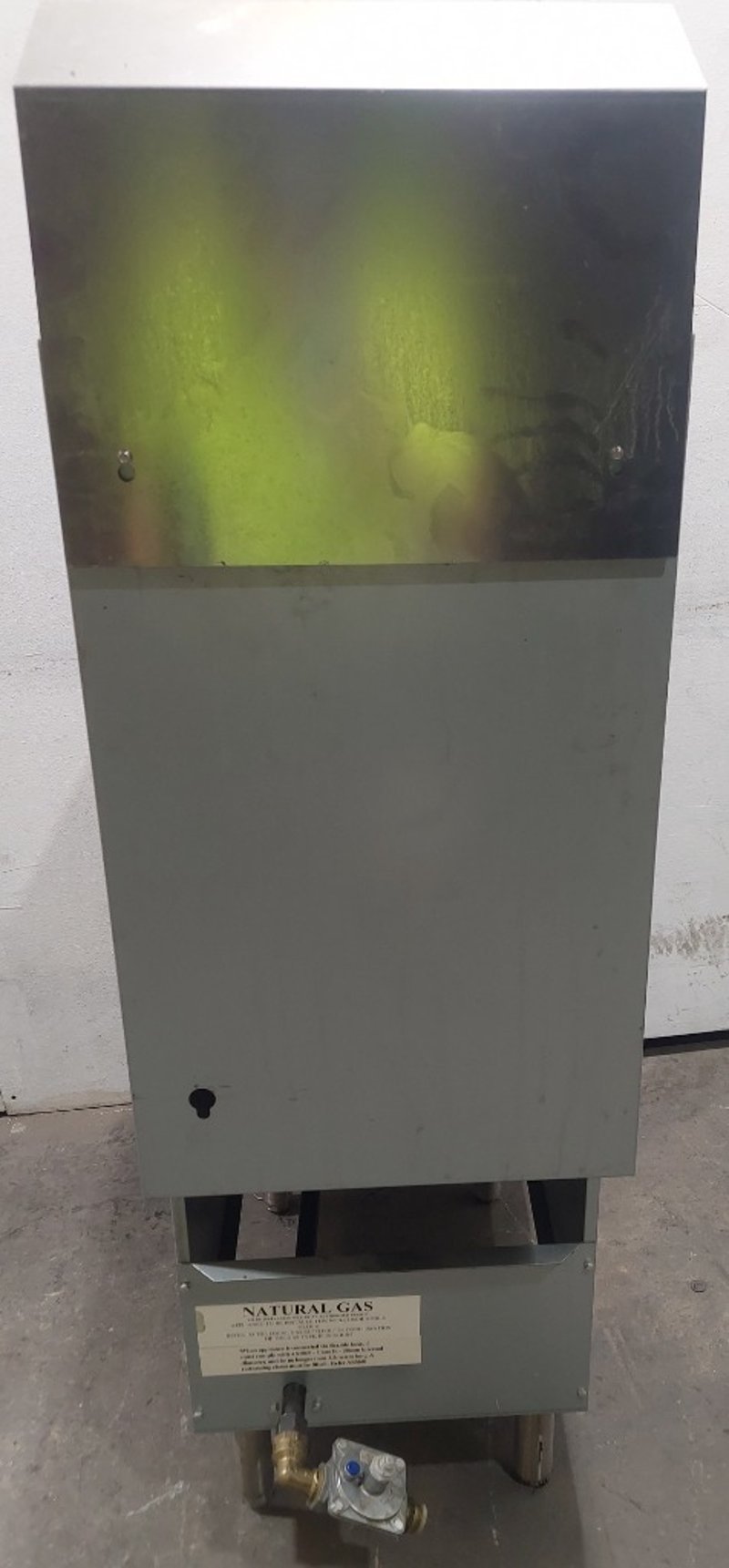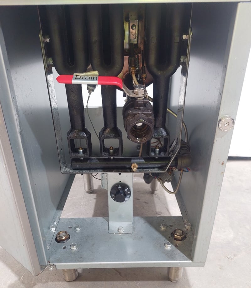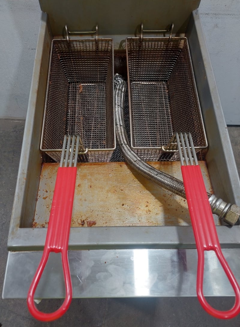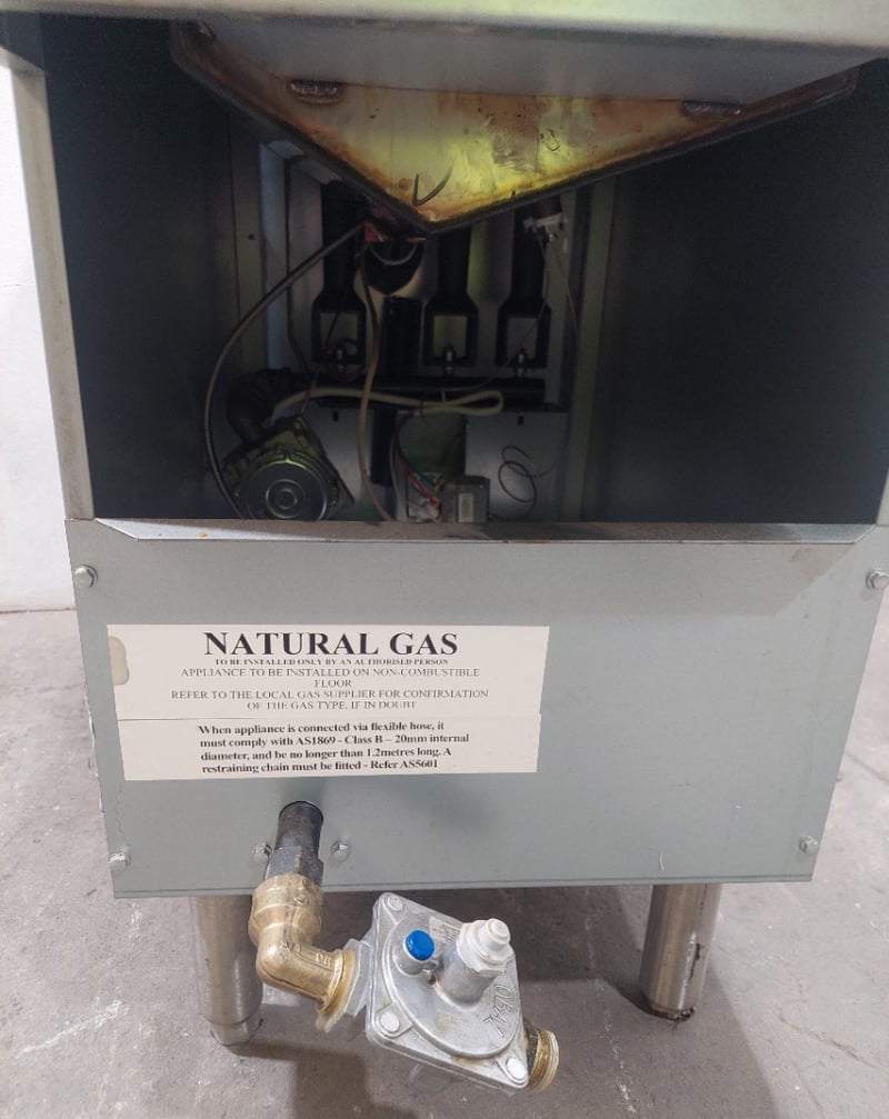 Commercial-grade natural gas deep fryer by FRY-O-MAX, Model RC300E, distributed by Federal Hospitality Equipment Sydney. Features dual stainless steel baskets with red handles, twin frying chambers with independent temperature control. Equipped with piloted gas burner system (visible drain valve labeled), thermostat control dial, and stainless steel construction throughout.Dims: 136cm H, 40cm W, 77cm D.Note: Sold as is , untested
