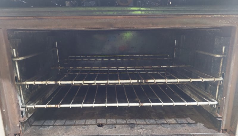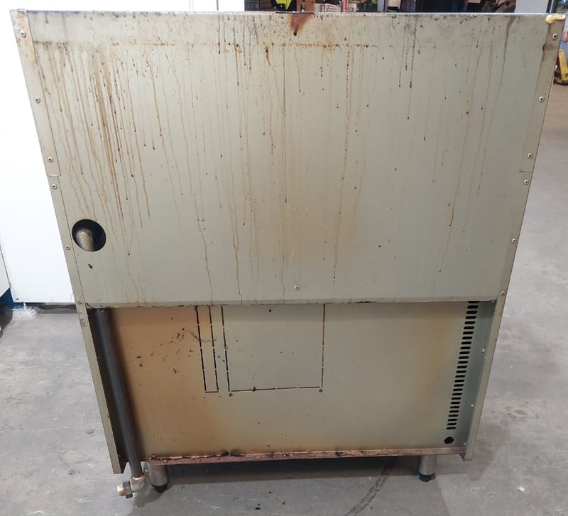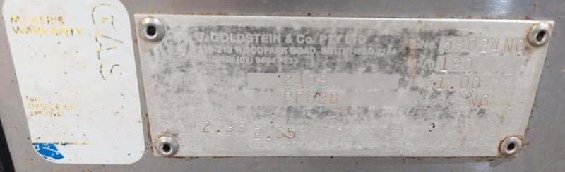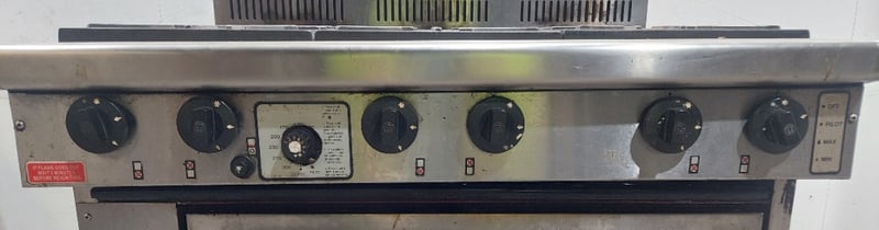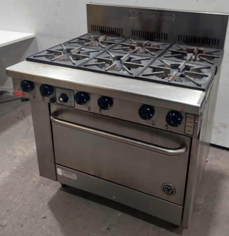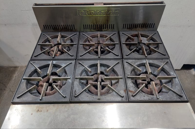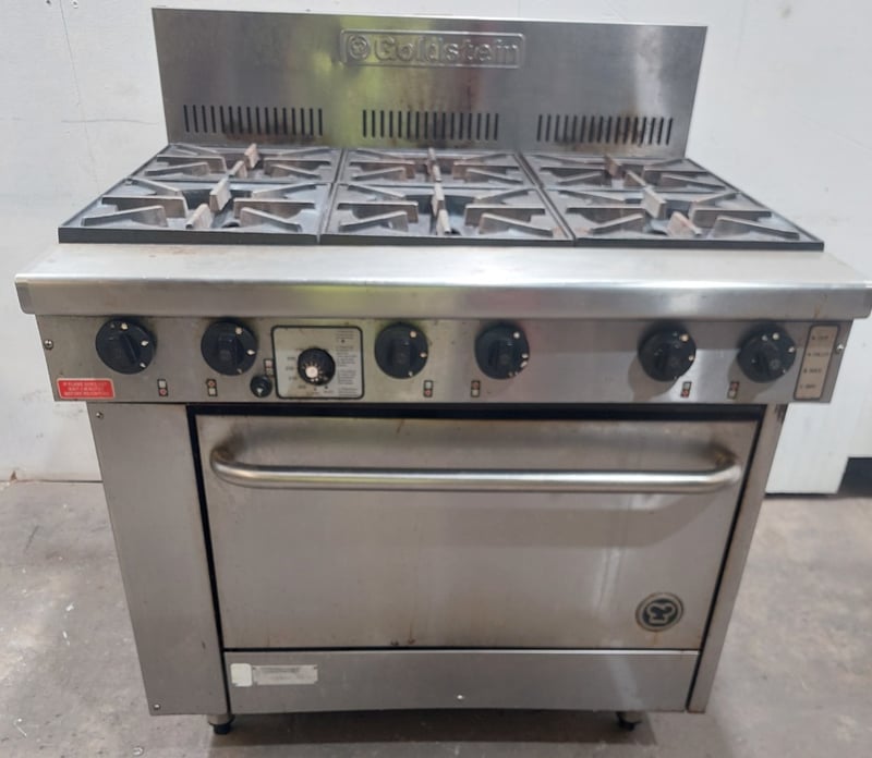 Goldstein commercial gas range, 6-burner cooktop with individual controls and pilot light system. Features a single standard oven below with two shelving racks and visible internal wear. Stainless steel construction with control panel showing six black knobs plus central pilot light dial. The unit displays operational wear consistent with heavy commercial kitchen use, including surface discoloration and patina. Cast iron gas burners show rust development. Rear splash-back has ventilation ports. Dims: 82cm H, 54cm W, 44cm D.Note: Sold as is - untested