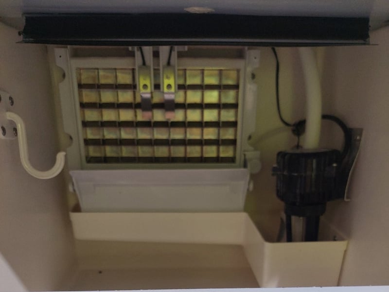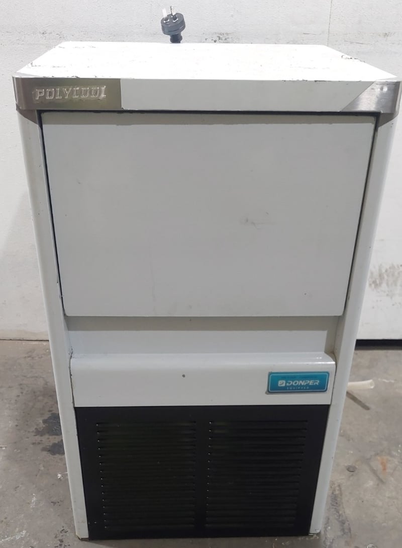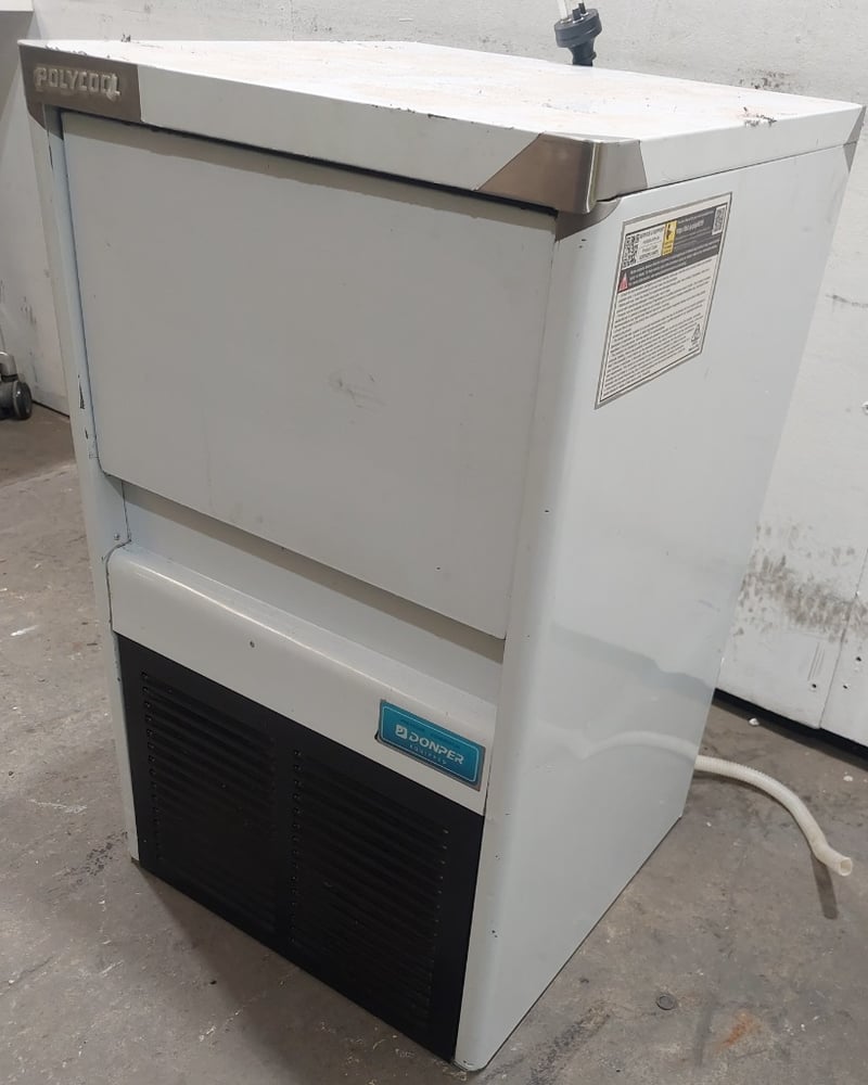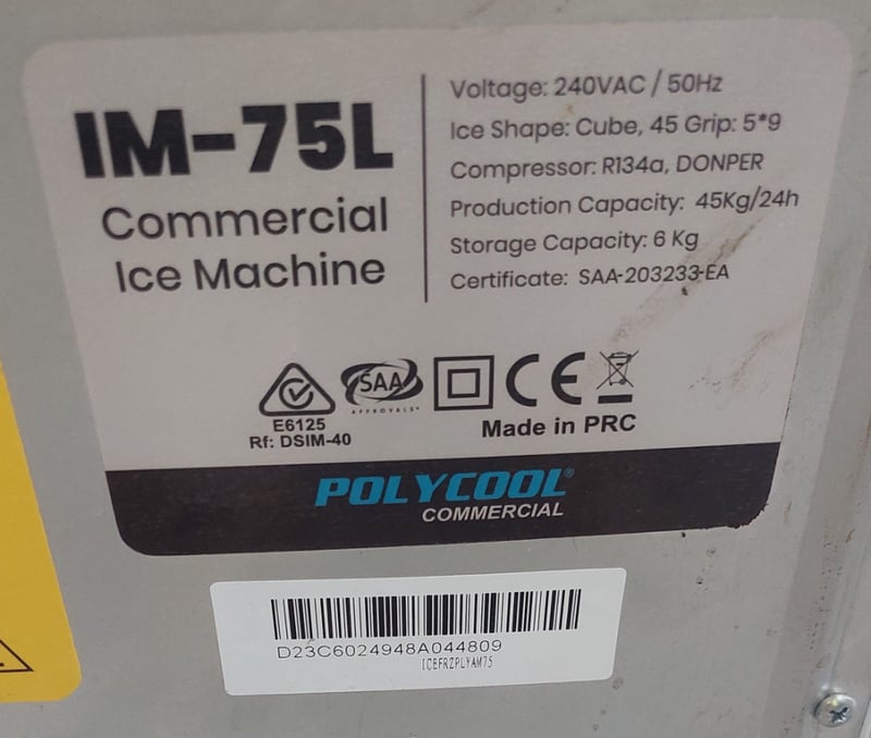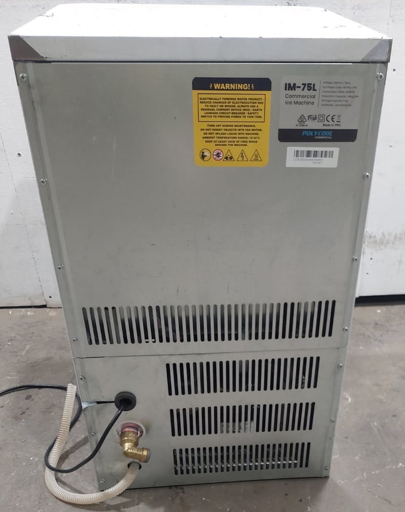 Polycool IM-75L Commercial Ice Machine. White exterior with black compressor housing. Cube ice shape with 5*9 grip configuration. 45kg/24h production capacity with 6kg storage capacity. Equipped with R134a Donper compressor. 240VAC/50Hz operation. Includes ice scoop and drainage system. Unit shows visible wear consistent with commercial use.