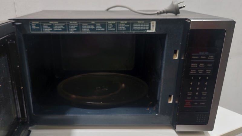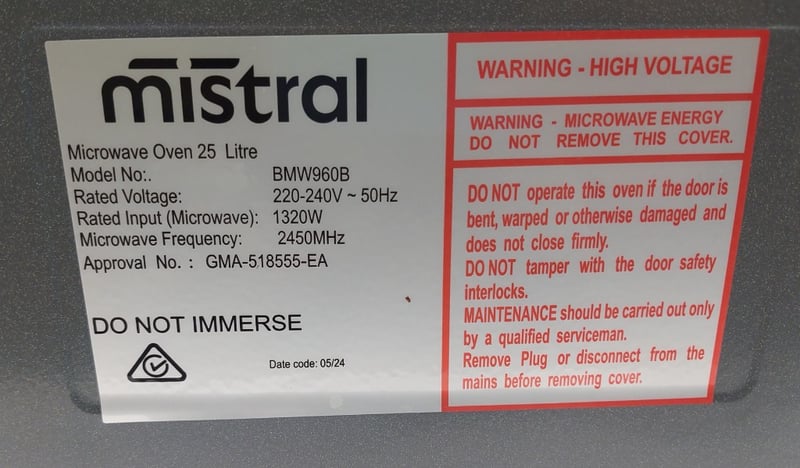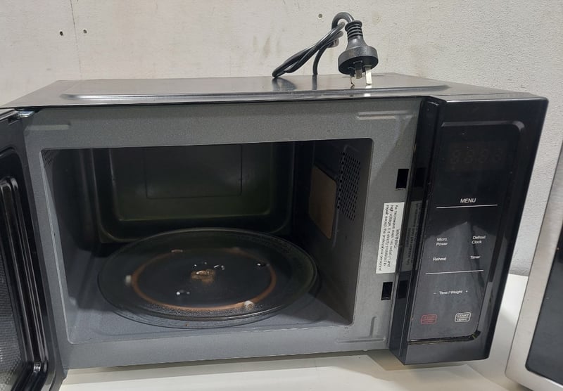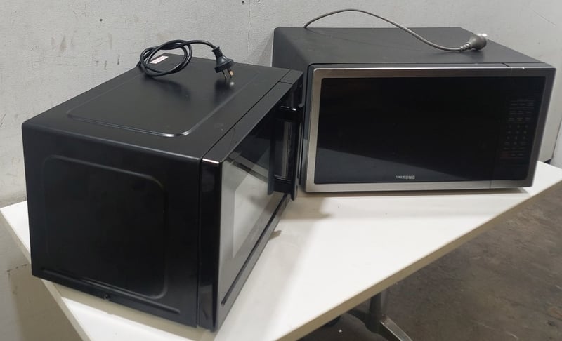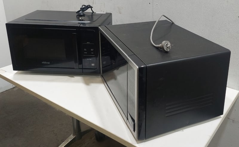 Lot comprising two microwave ovens. Mistral model BMW960B, 25-litre capacity, 1320W microwave power, 2450MHz frequency, 220-240V 50Hz operation, manufactured May 2024. Samsung model ME5124ST, 24-litre capacity, 1000W microwave output, 1600W total input, 2450MHz frequency, 240V 50Hz operation, manufactured May 2017. Both units feature digital controls, turntable systems, and standard microwave functionality. The Mistral unit displays minor surface wear consistent with display/demonstration use. The Samsung unit shows moderate cosmetic wear with some interior oxidation visible on the turntable.