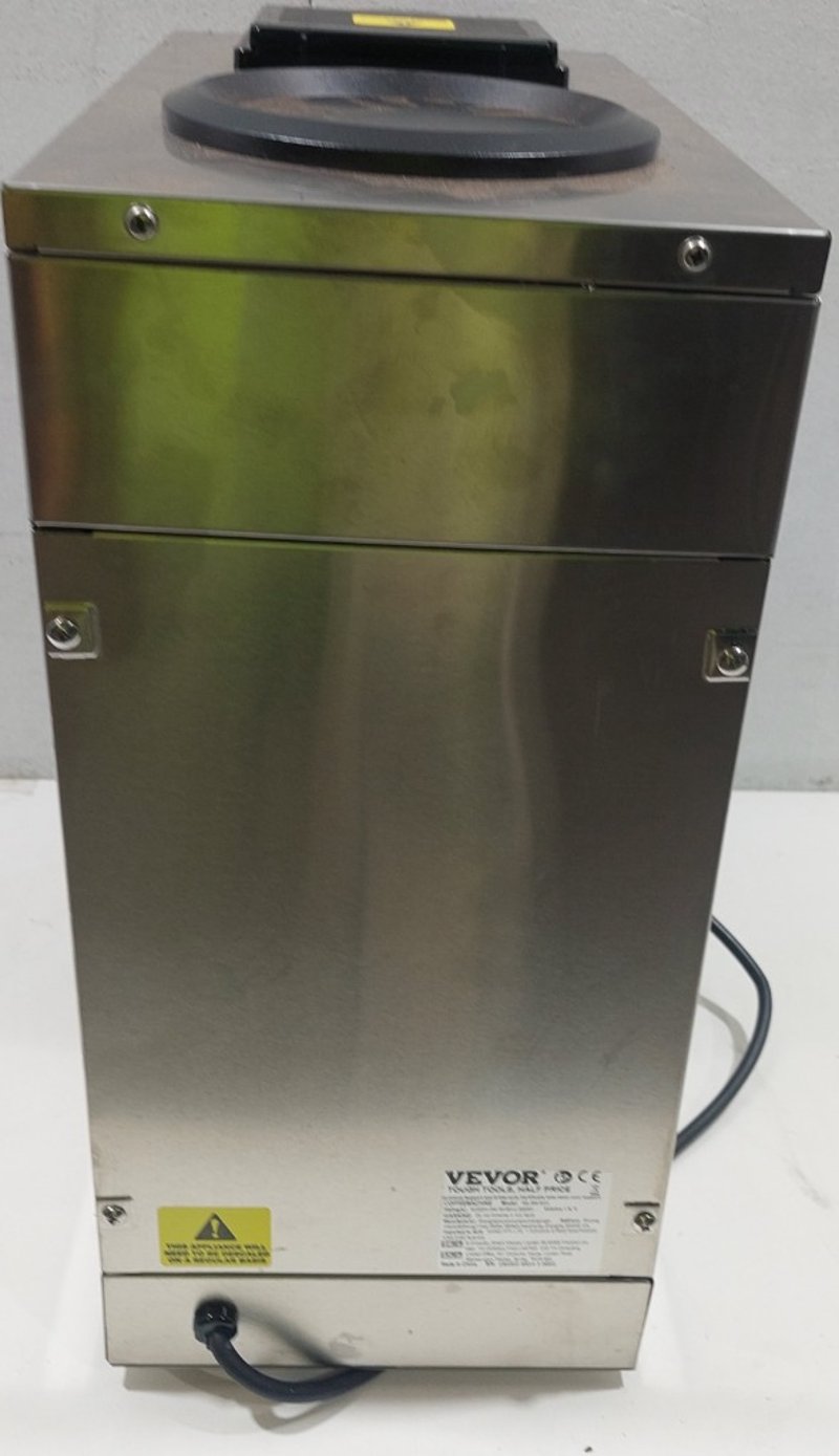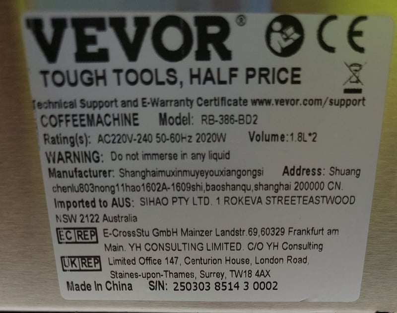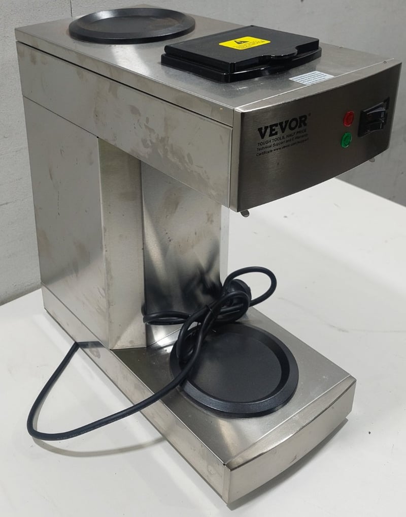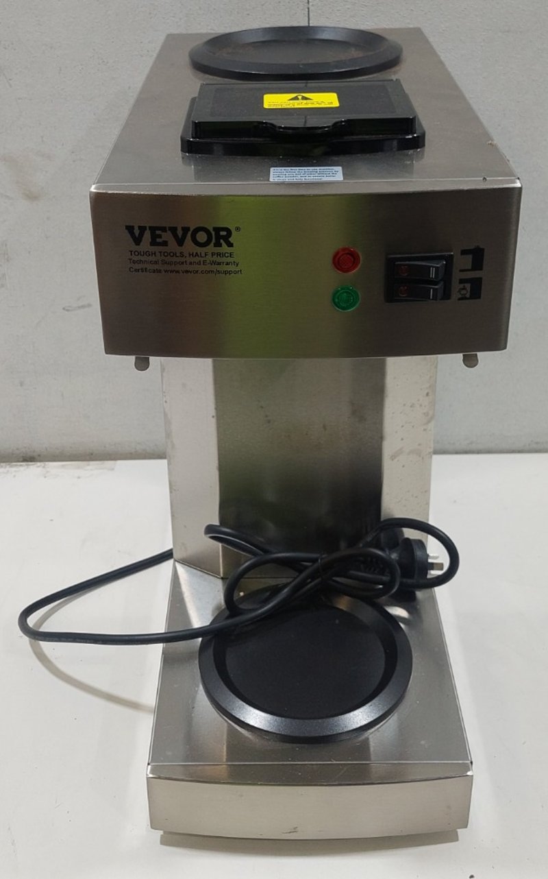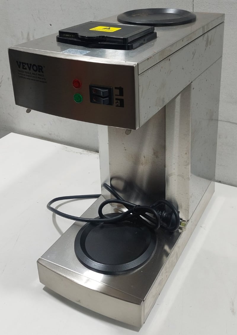VEVOR Commercial Coffee Machine Model RB-386-BD2. Stainless steel dual-pot coffee brewer designed for high-volume café and restaurant use. Features two 1.8L thermal carafe capacity, automatic brewing cycle with programmable controls, red and green indicator lights for operational status, and dual warming plate system. Equipped with black thermal carafes and drip trays. Rated 220-240V AC, 50-60Hz, 2020W power consumption. Professional-grade construction with stainless steel housing and robust internal mechanisms.