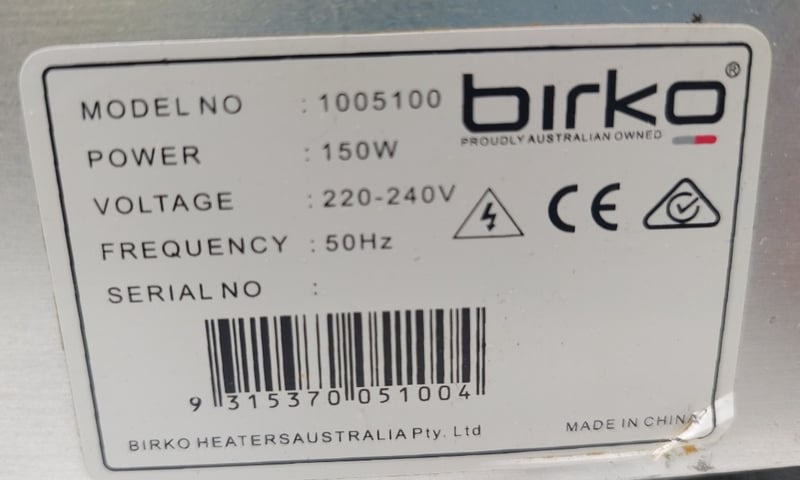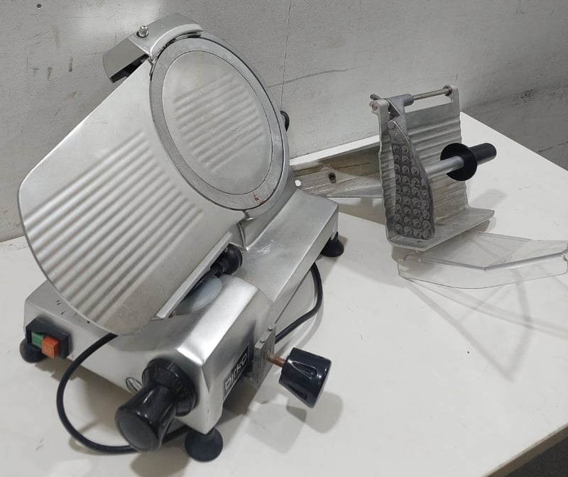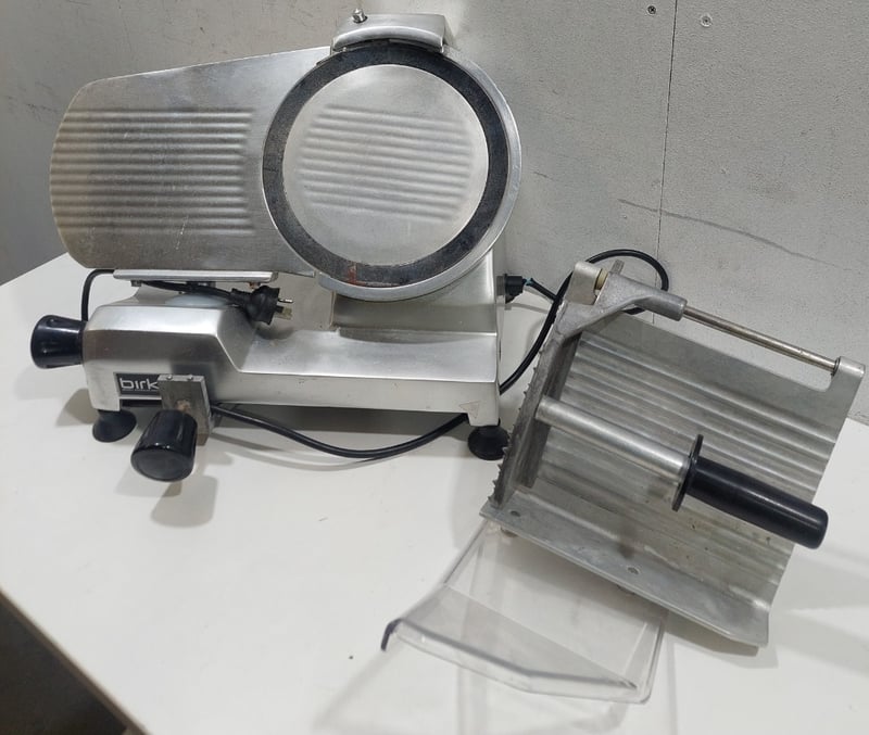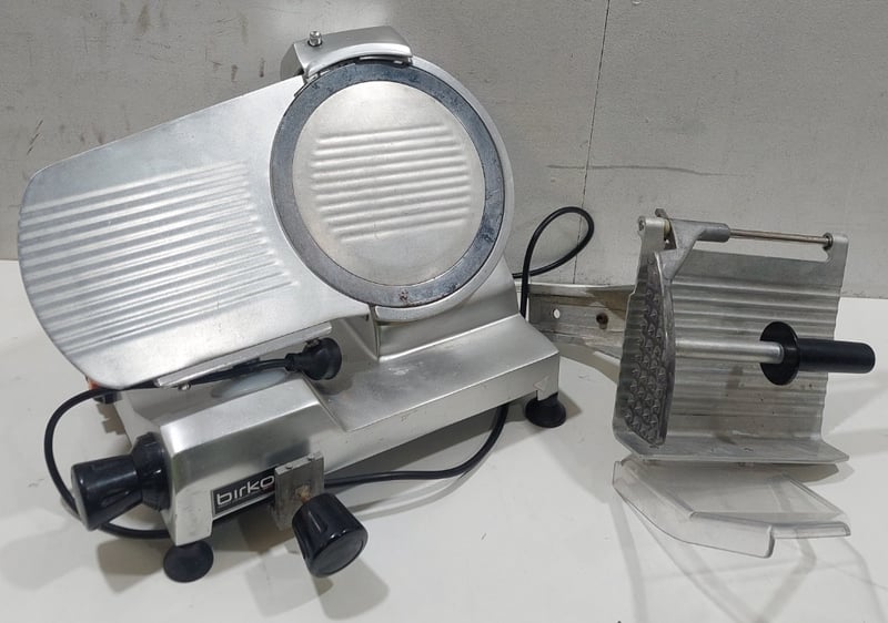 Birko Model 1005100 commercial meat slicer, Australian-made by Birko Heaters Australia Pty. Ltd. Features a 220mm diameter slicing blade with protective circular guard, variable thickness adjustment knob, and integrated food carriage with textured grip handle. Includes detachable pusher/guide assembly for safe operation. 150W motor, 220-240V AC, 50Hz frequency. Stainless steel construction throughout with aluminium ribbed housing.Note: sold as is, untested, may have missing pieces