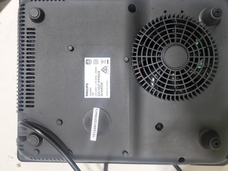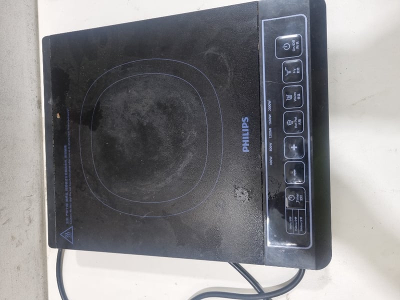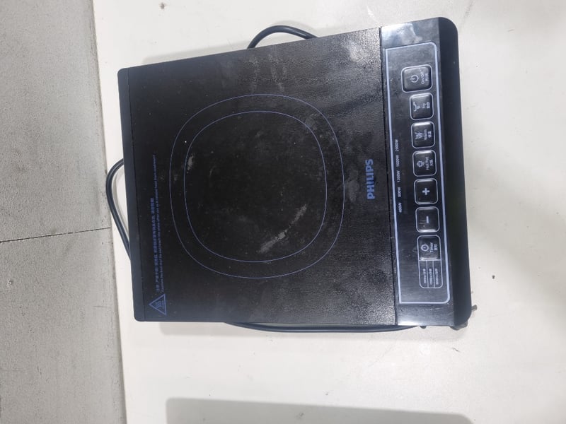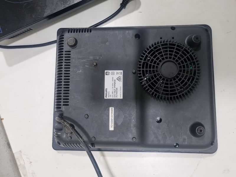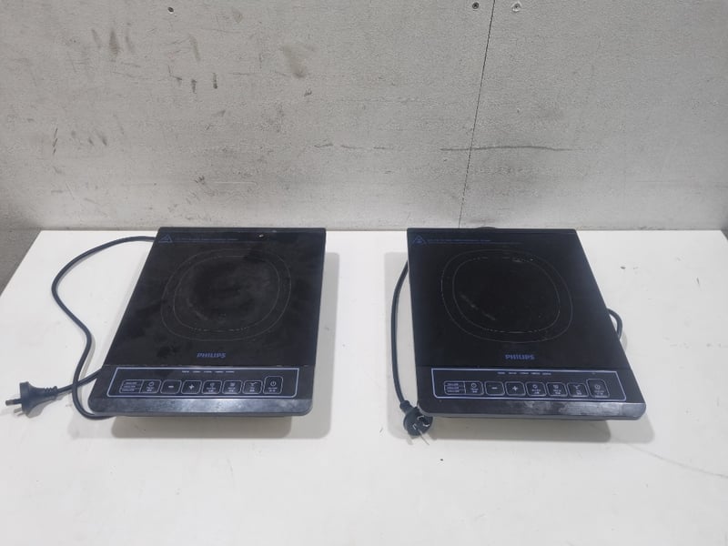 Philips portable induction cooktops . Two compact models feature black casings with touch-control panels displaying 8 control buttons, induction cooking surfaces with circular heat zones, and attached power cords with standard plugs. Model showcases extended dimensions with vertical side-mounted controls (approximately 7 buttons), similar induction technology, and integrated cooling fan visible on underside. Note : sold as is
