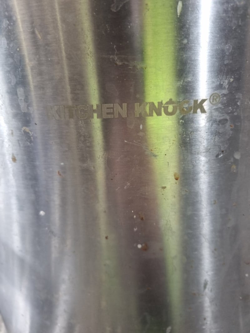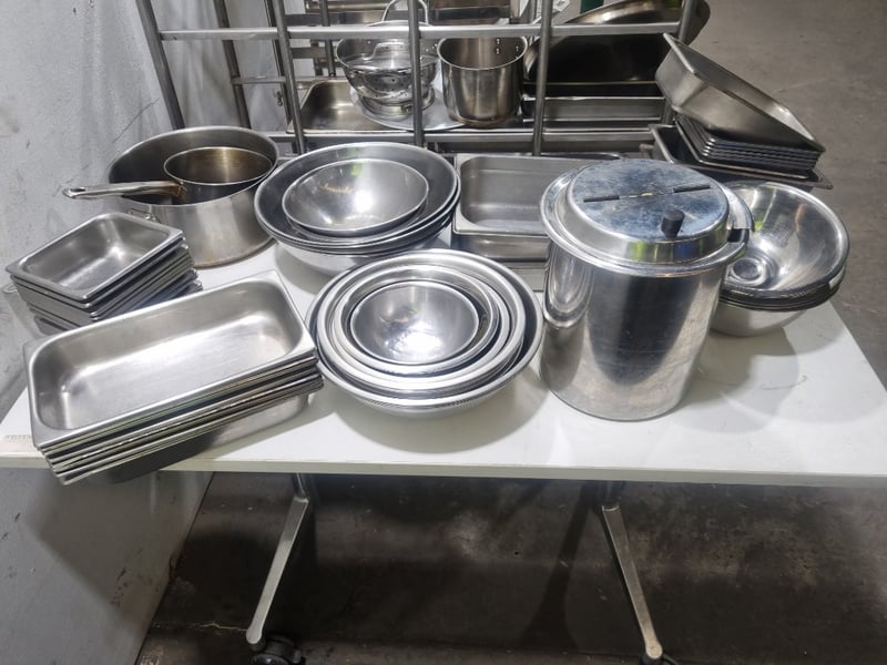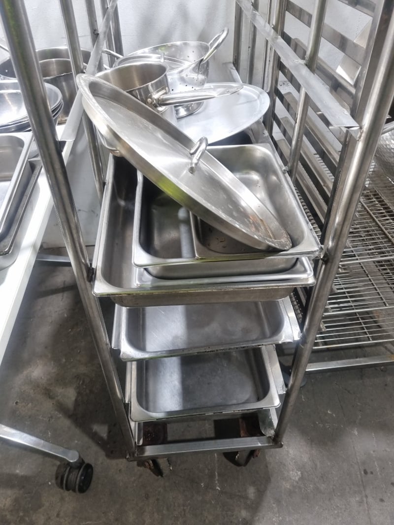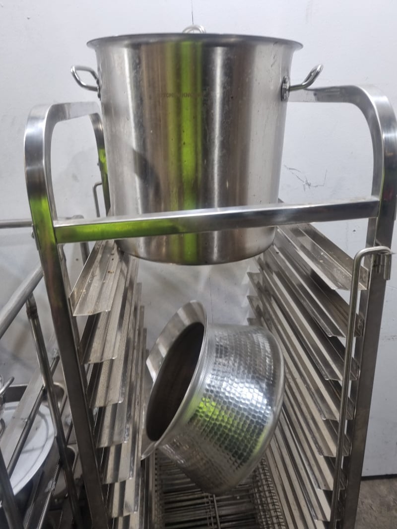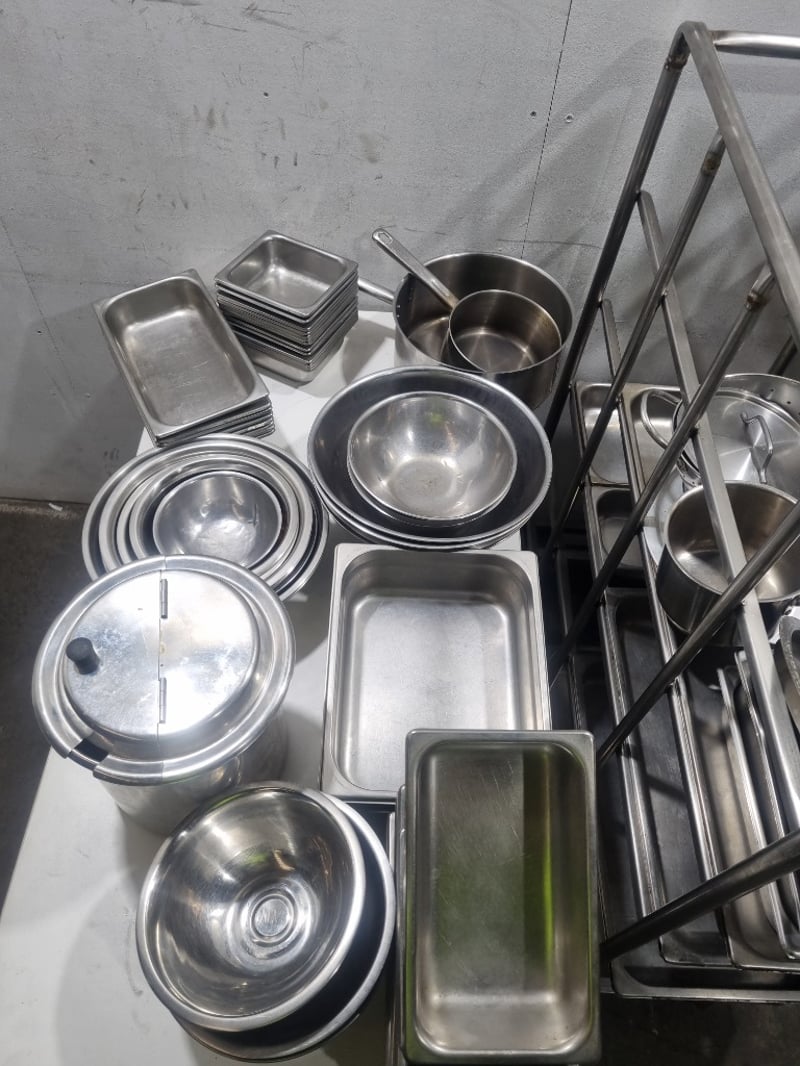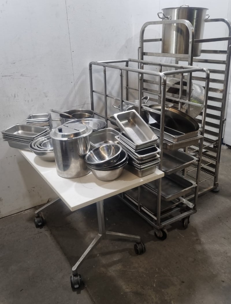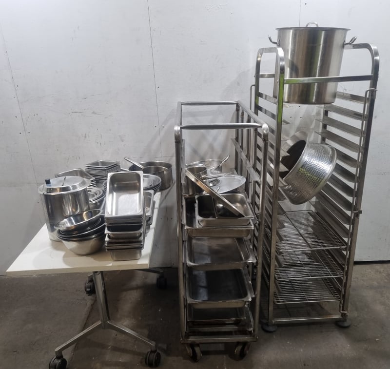 Comprehensive commercial kitchen equipment package featuring stainless steel cookware and specialized storage solutions. Includes two mobile storage trolleys with multiple tiers (approximately 4-5 shelf levels each), one large stainless steel stock pot (approximately 20-25 liters capacity) with lid and dual handles, one colander/strainer basket with handle, multiple saucepans with lids in varying sizes, numerous stainless steel gastronorm trays (1/1, 1/2, and 1/4 sizes), mixing bowls, plates, and serving utensils. Additional items includes,one tall narrow mobile storage rack with slatted shelving. The large stock pot is branded "Kitchen Knock". Equipment displays patina and age-related surface marks consistent with active commercial kitchen use.