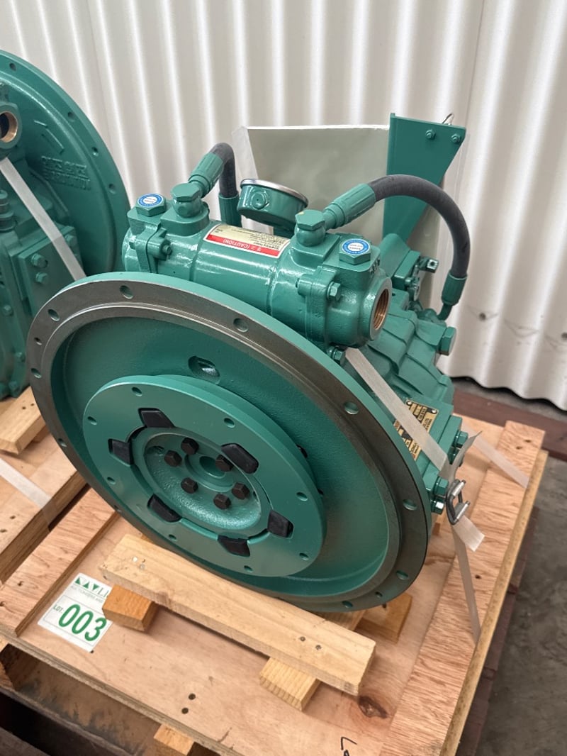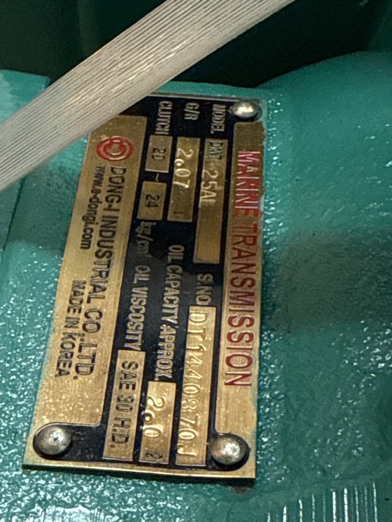 D-I Marine Transmission / Gearbox – DMT25AL (New / Unused) Condition: New, unused – strapped to original pallet Brand: Dong-I Industrial Co. Ltd Made in: Korea Specifications (from ID plate): • Model: DMT25AL • Reduction Ratio: 2.07 : 1 • Clutch Pressure: 20–24 kg/cm² • Rated 64kw/86hp@2300rpm • Oil Capacity: Approx. 2.0 l • Oil Viscosity: SAE 30 H.D. • Serial No.: DT1440870J • Type: Marine transmission / gearbox Onsite Location: Tweed, NSW ( Not Lloyds Branch )