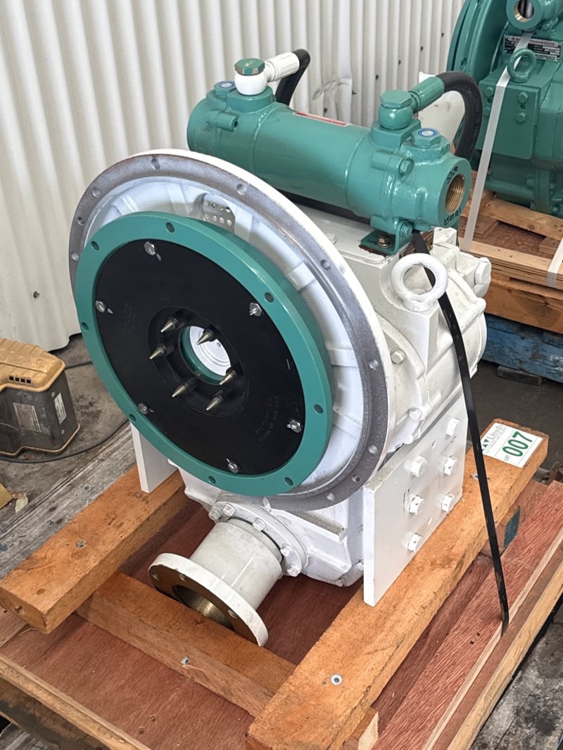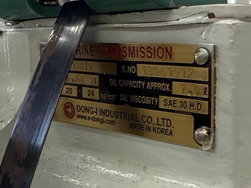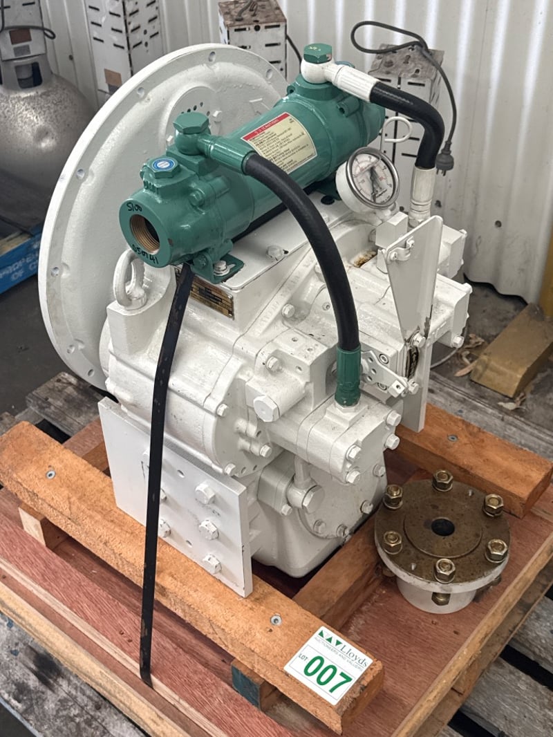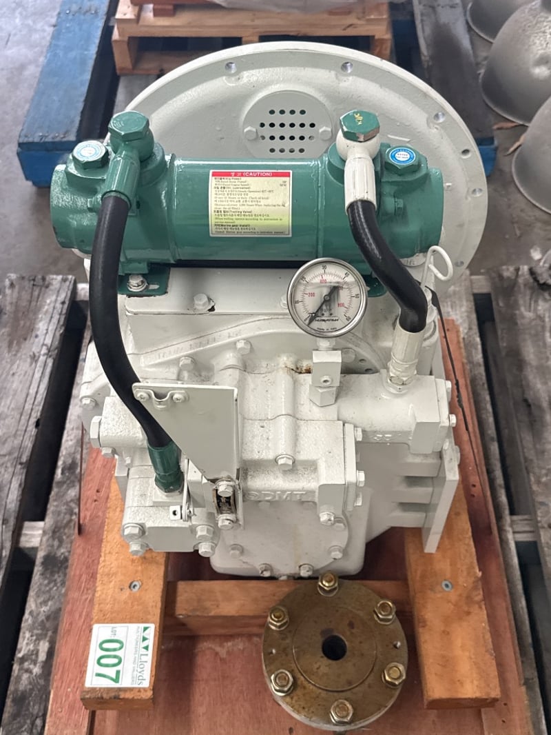 D-I Marine Transmission / Gearbox – DMT-100IV (New / Unused) Condition: New, unused – mounted on pallet Brand: Dong-I Industrial Co., Ltd Manufactured in: Korea Specifications (from ID plate): • Model: DMT-100IV • Gear / Reduction Ratio: 1.54 : 1 • Serial Number: 13061912 • Clutch Pressure: 20–24 kg/cm² • Rated 243kw/326hp@2300rpm • Oil Viscosity: SAE 30 H.D. • Oil Capacity: 7 litres • Type: Marine transmission / gearbox Onsite Location: Tweed, NSW ( Not Lloyds Branch )