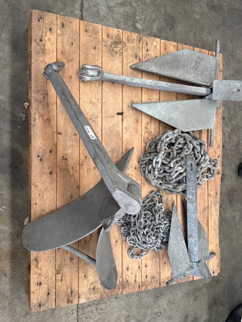 Marine Anchors & Galvanised Chain – Job Lot,suitable for boats, pontoons, moorings, and marine use.Includes: • Large fluke-style anchor • Various anchor arms and mounting componentsOnsite Location: Tweed, NSW ( Not Lloyds Branch )
