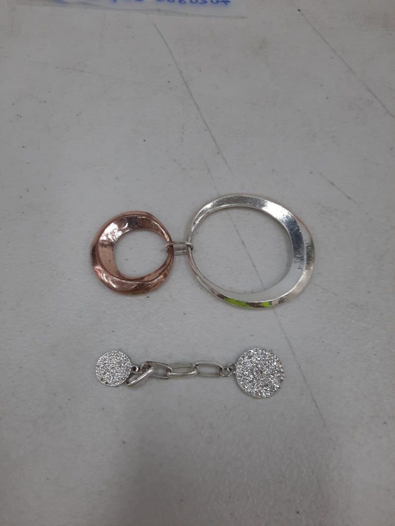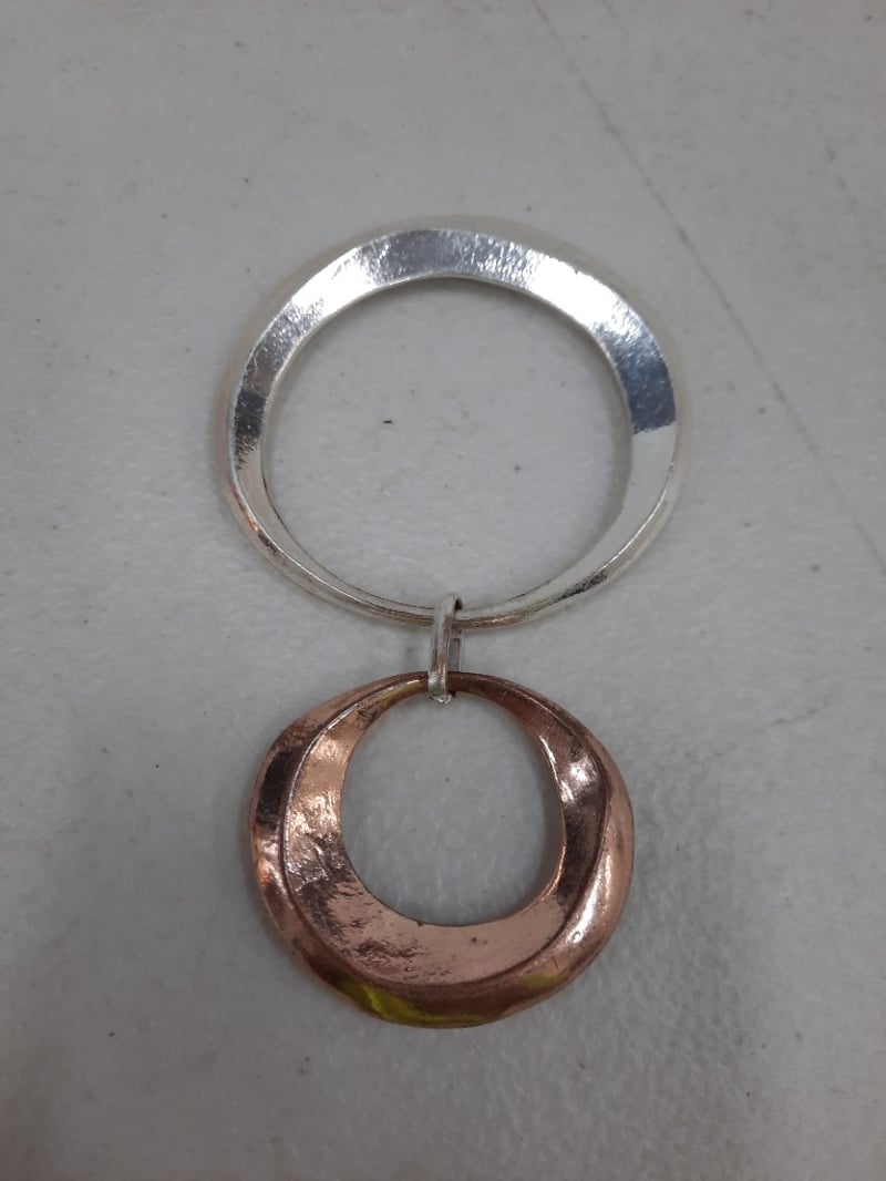 Two piece charm. One large silver coloured circle linked to smaller bronze coloured circle