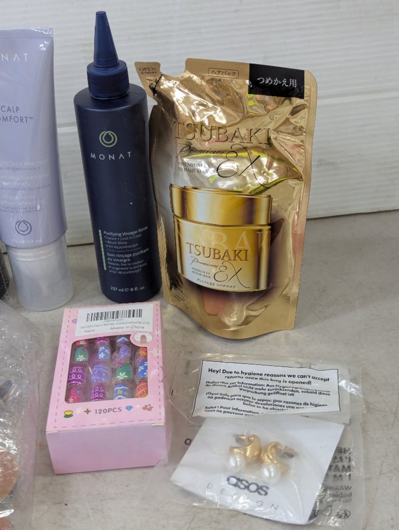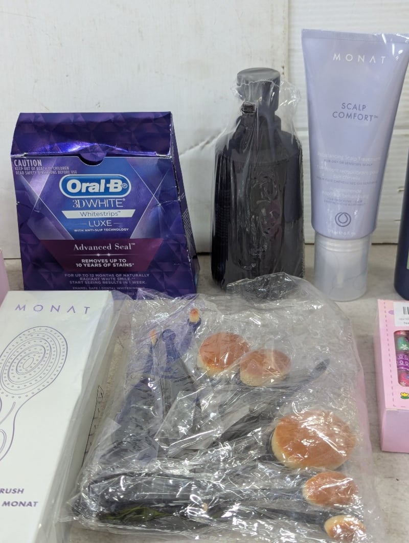Assorted beauty products, includes lip kits, white strips, makeup brushes and more