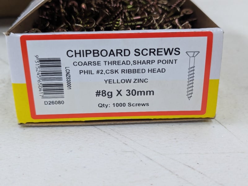 Chipboard screws, coarse thread, sharp point, phil #2, csk ribbed head, yellow zinc, #8g x 30mm, 1000 screws per box, 6 boxesSOLD AS LOT
