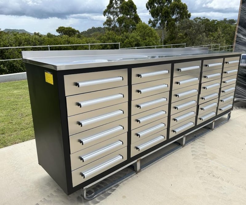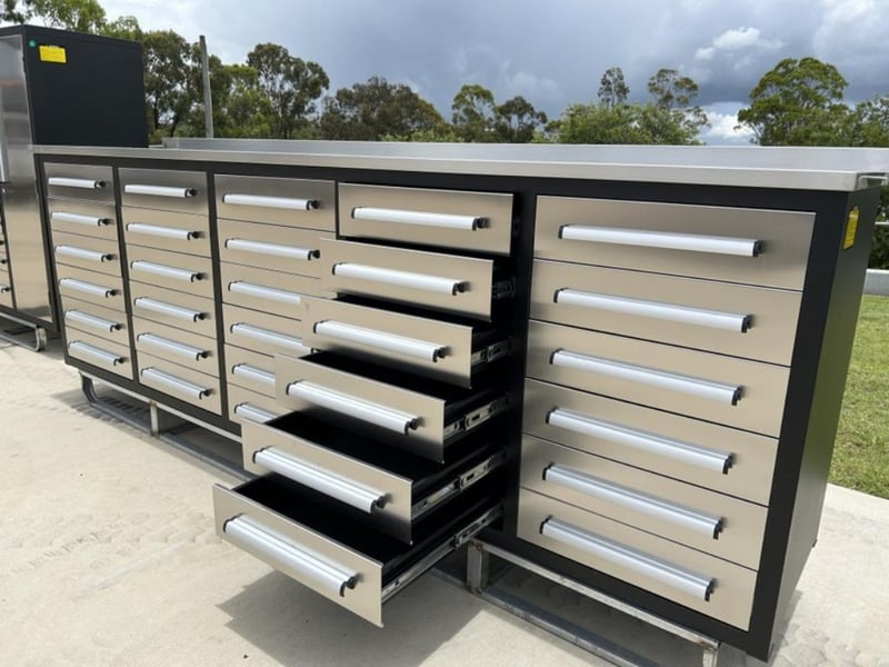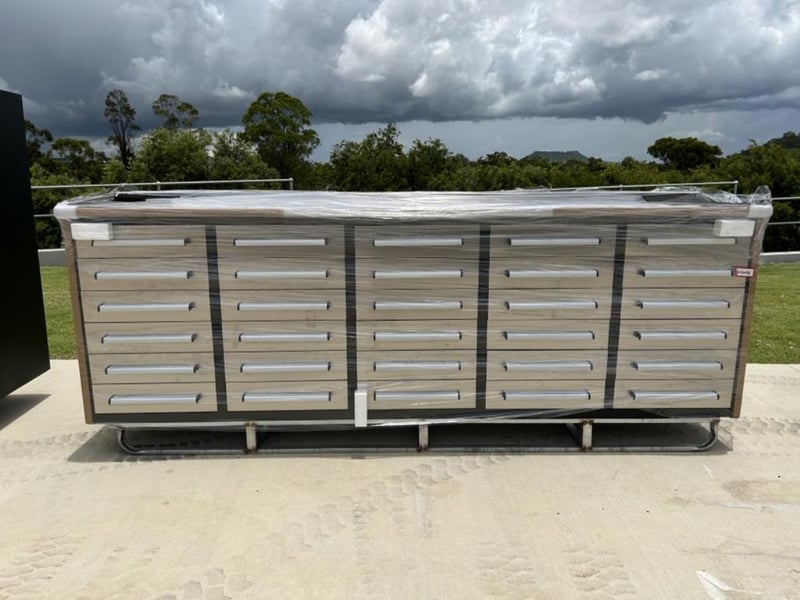 Unused 30 Drawer Stainless Steel Work Bench (Low Type), Model: 10ft-30D-Low, 3 Part Sliding Drawer System, Approximate Shipping Dimensions: L2870mm x W610mm x H1075mm, Weight: 265 kgsRef: S01890Location: Shepparton, VIC