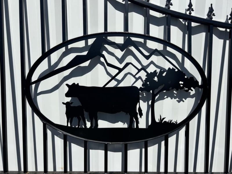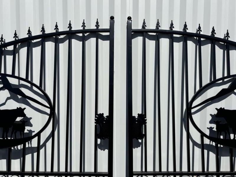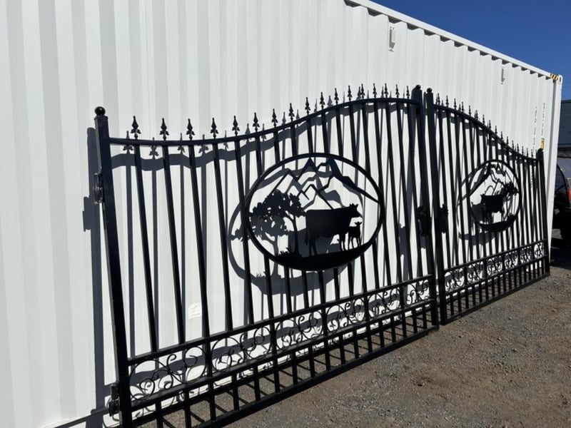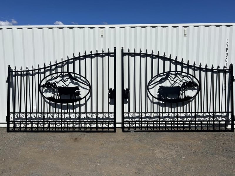 et of 2 Large Unused Wrought Iron Style Gates with Cow Scene, Each gate is 10ft wide, Height at High Side: 2.3m, Height at Low Side: 1.8m, Made from Galvanised Steel, Total Approximate Combined Weight of both gates: 175kg