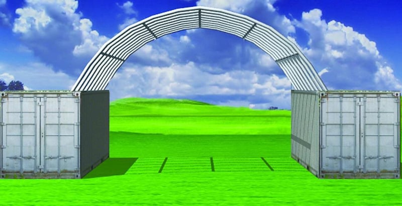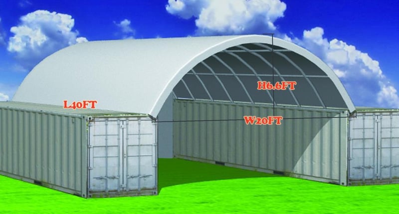 Unused Heavy duty 40ft Container shelter with end wall, 20ft Wide, Model: C2040H, 20ft wide x 40ft long x 6ft 6in High, with end wall, includes tarp, Heavy duty PVC fabric, galvanised tube frame, Approximate Shipping Dimensions: 1930mm L x 745mm W x 540mm H, Approximate Weight: 360kg