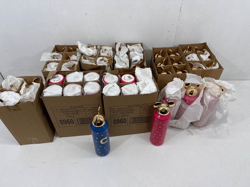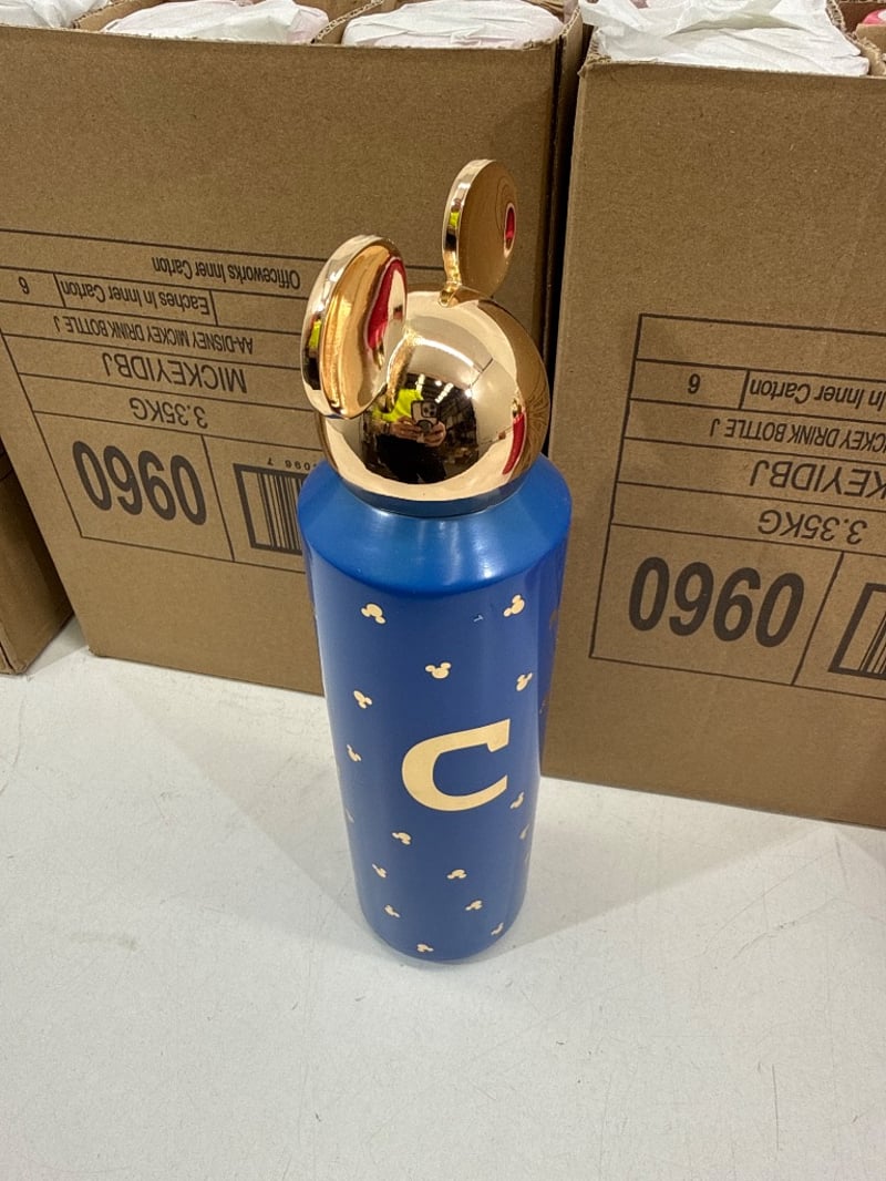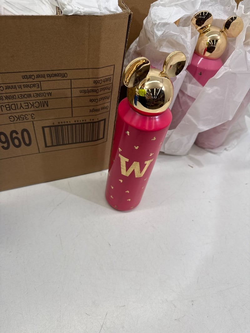 Drink bottles, Mickey Mouse drink bottles. Assorted colours including Pink/ Blue/ black etc. Assorted letters. Quantity- box sold as lot.