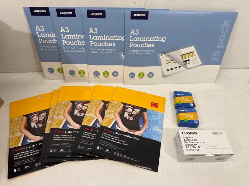 Office Supplies, Assorted office supplies including T-shirt Transfers, Labels, A3 Laminating Pouches etc, Assorted Brands including Kodak, J. burrows etc. Quantity to box, sold as lot.