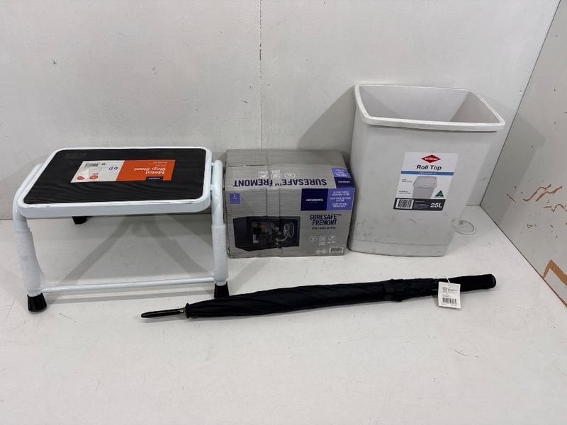 Office Accessories, Assorted office accessories including step stool, Bin, Safe etc. Assorted brands including J.Burrows, Willow etc. Quantity- 4 items, sold as lot