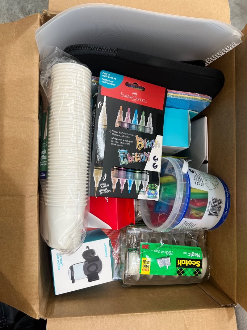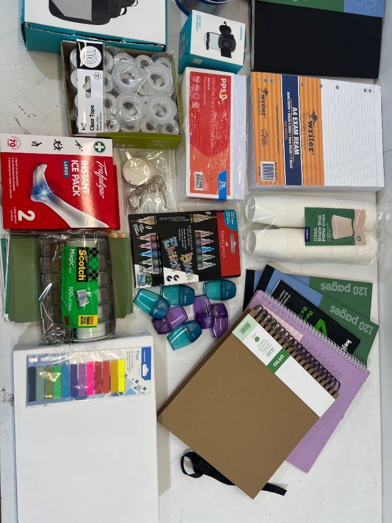 Assorted office supplies, includes; notebooks, key tags, tape, computer case etc, brands include; kevion, J.Burrows, scotch etc