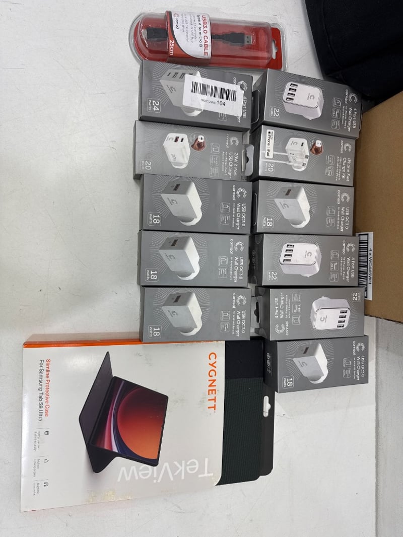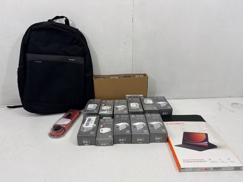 Charger Port/ Laptop and iPad case, Comsol USB wall Port charger, Cygnett Slimline Protective Case for Samsung Tab s9 ultra, Tagus Eco smart backpack. Quantity- sold as lot.
