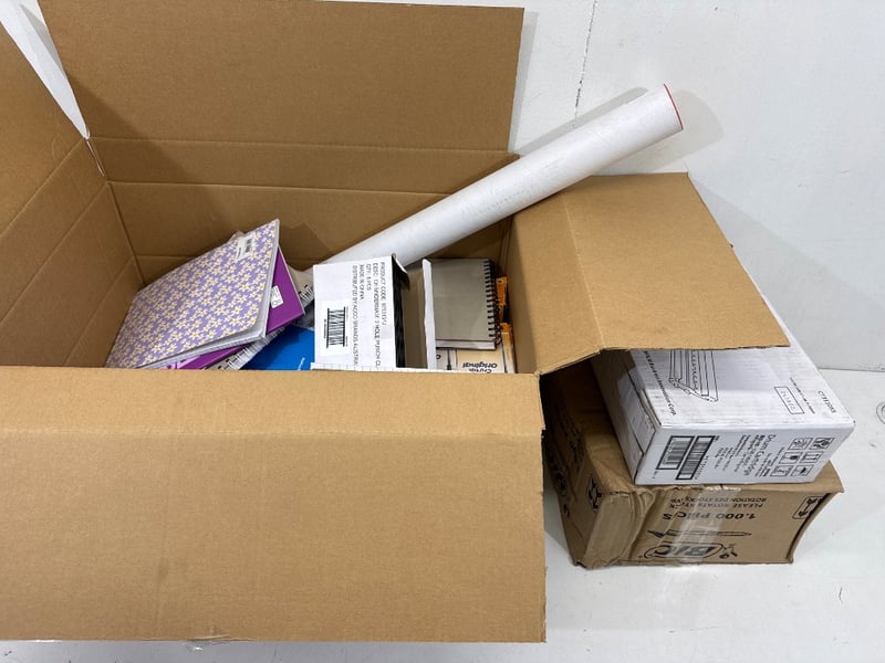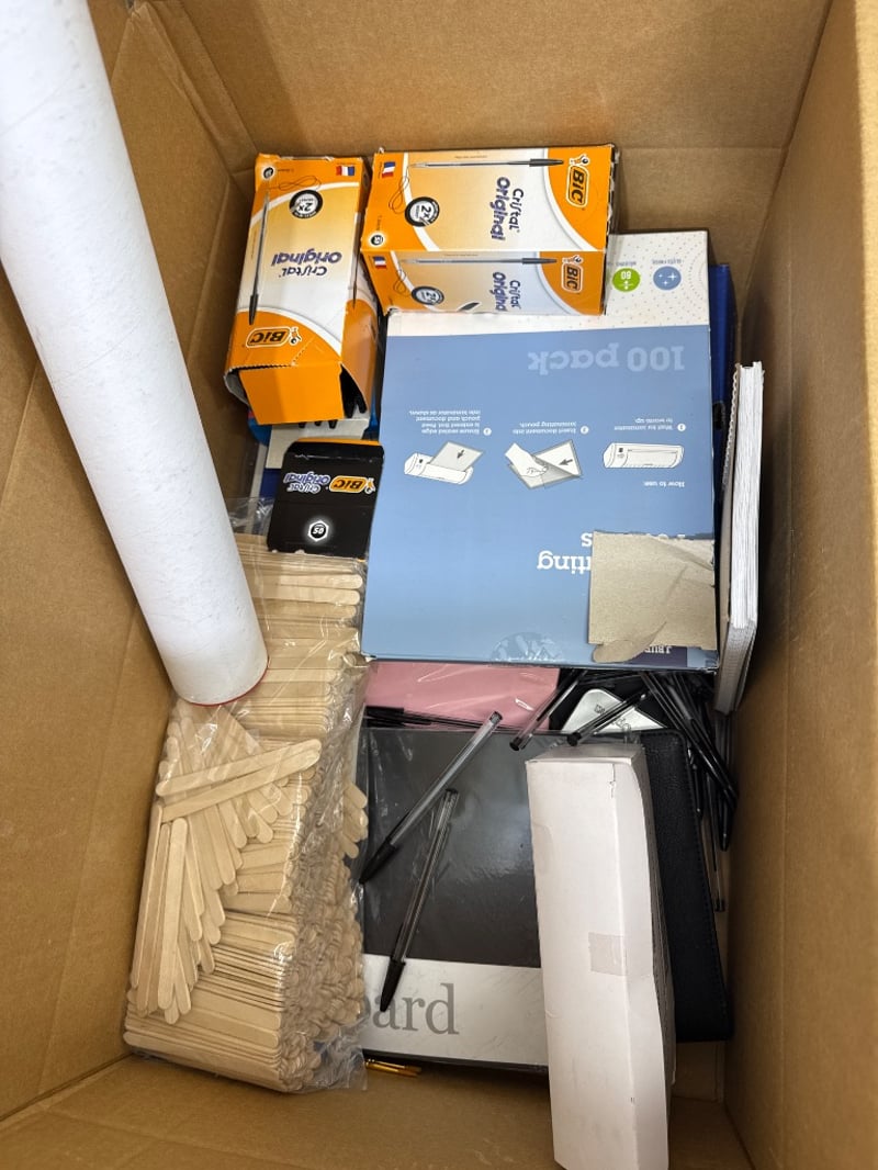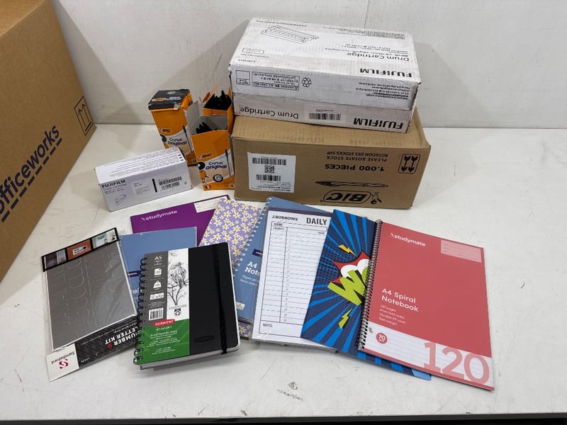 Office Supplies, Assorted office including Pens, printer cartridges, diary/ Workbooks, hole puncher etc. Assorted brands including BIC, study mate etc.