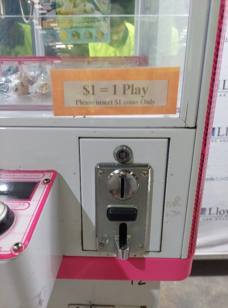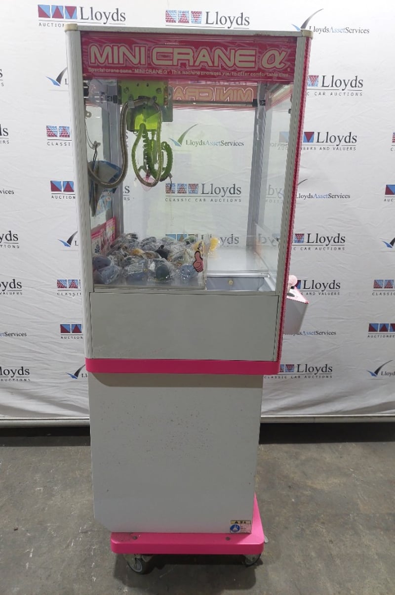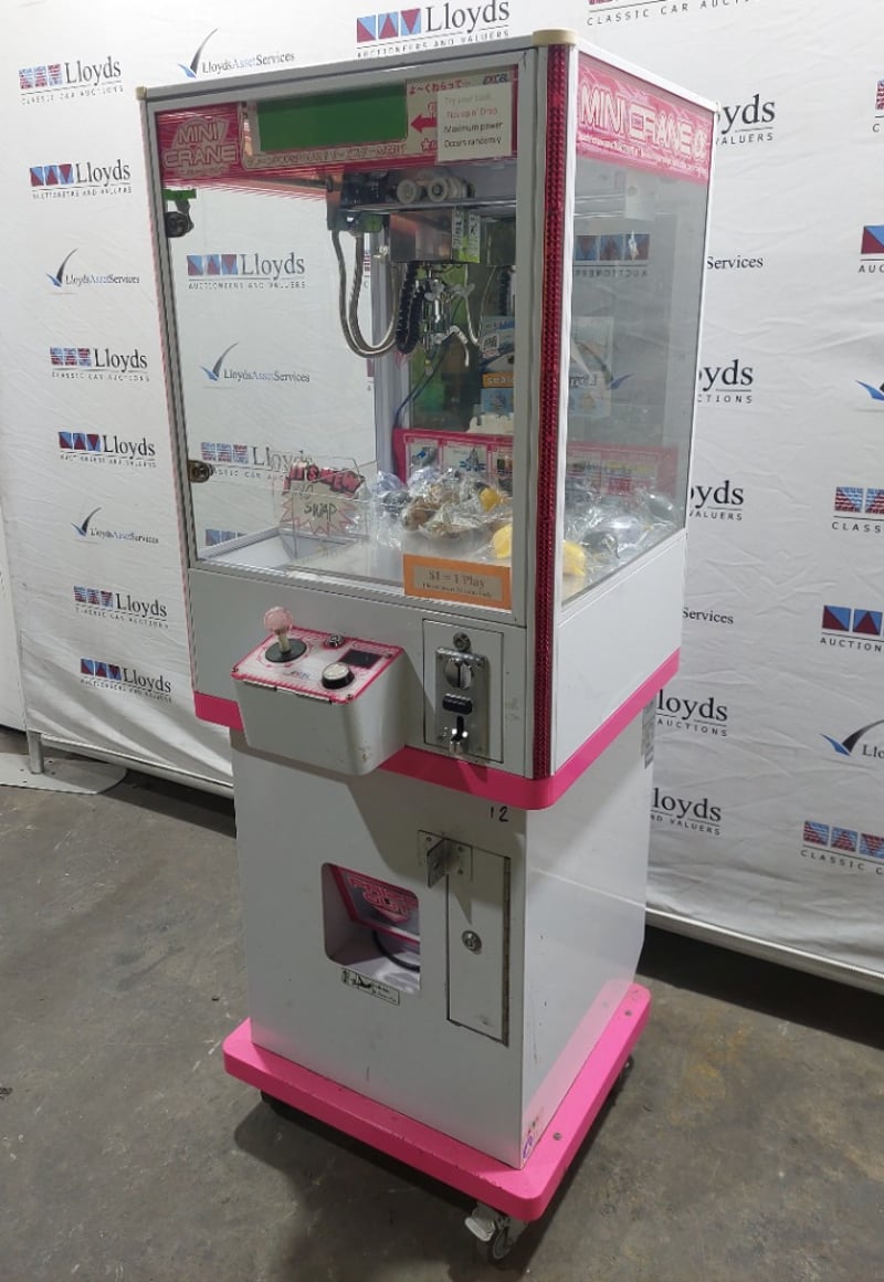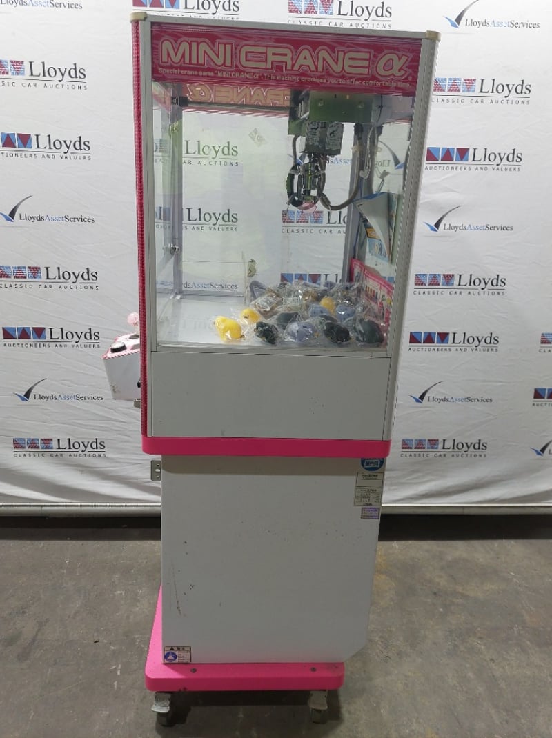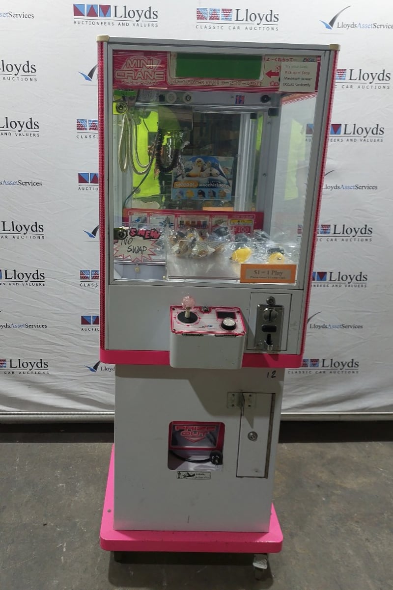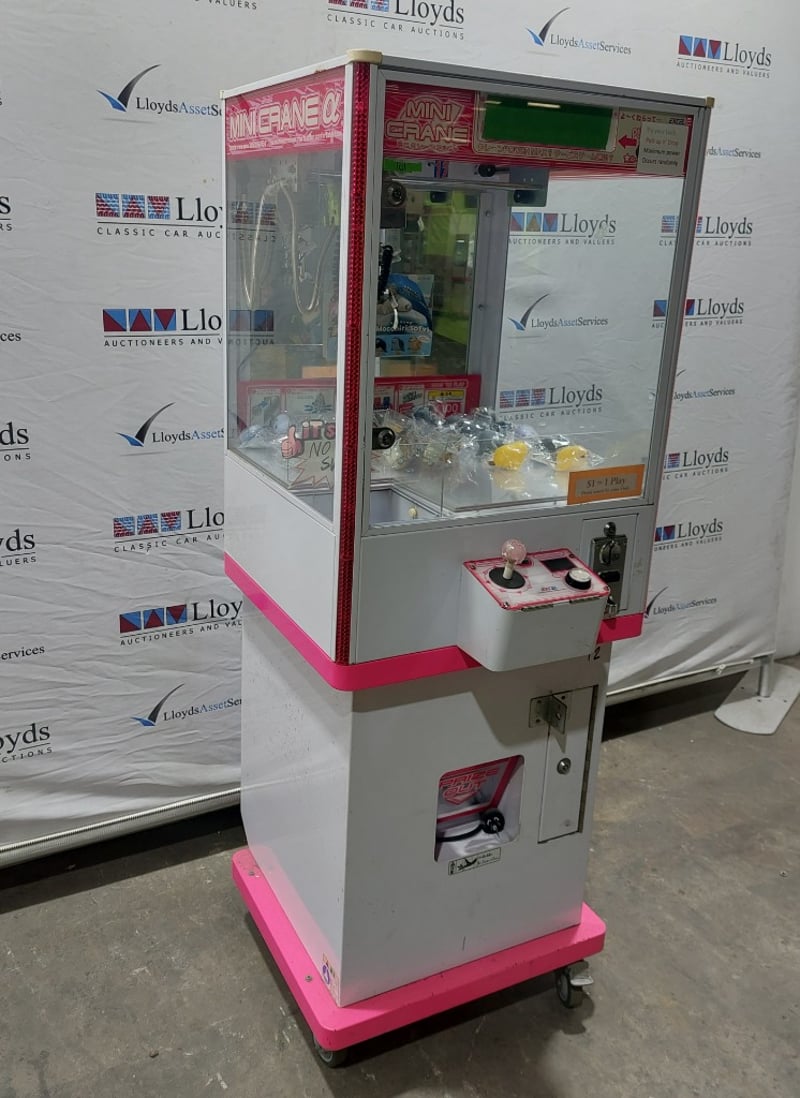 Arcade Claw Machine - Excel 'Mini Crane', single player, pink theme, joystick controls, coin operated, mobile.S/N: 2861174Dims: 1600mm x 700mm x 700mm Note: Item is untested, with signs of wear keys included.