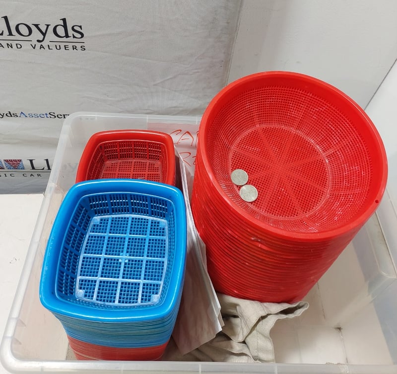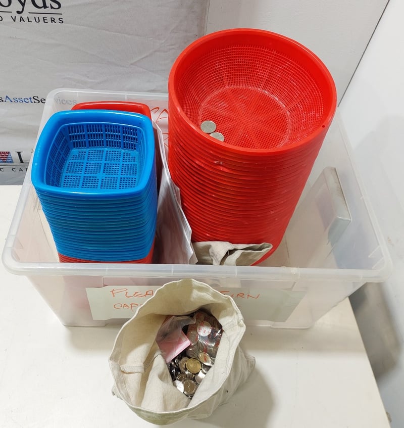 Assorted coin baskets and arcade tokens.Sold as a lot. Note: signs of wear.