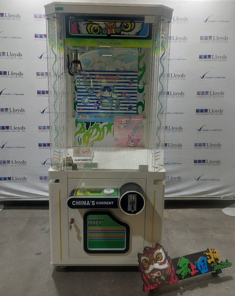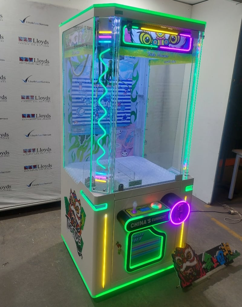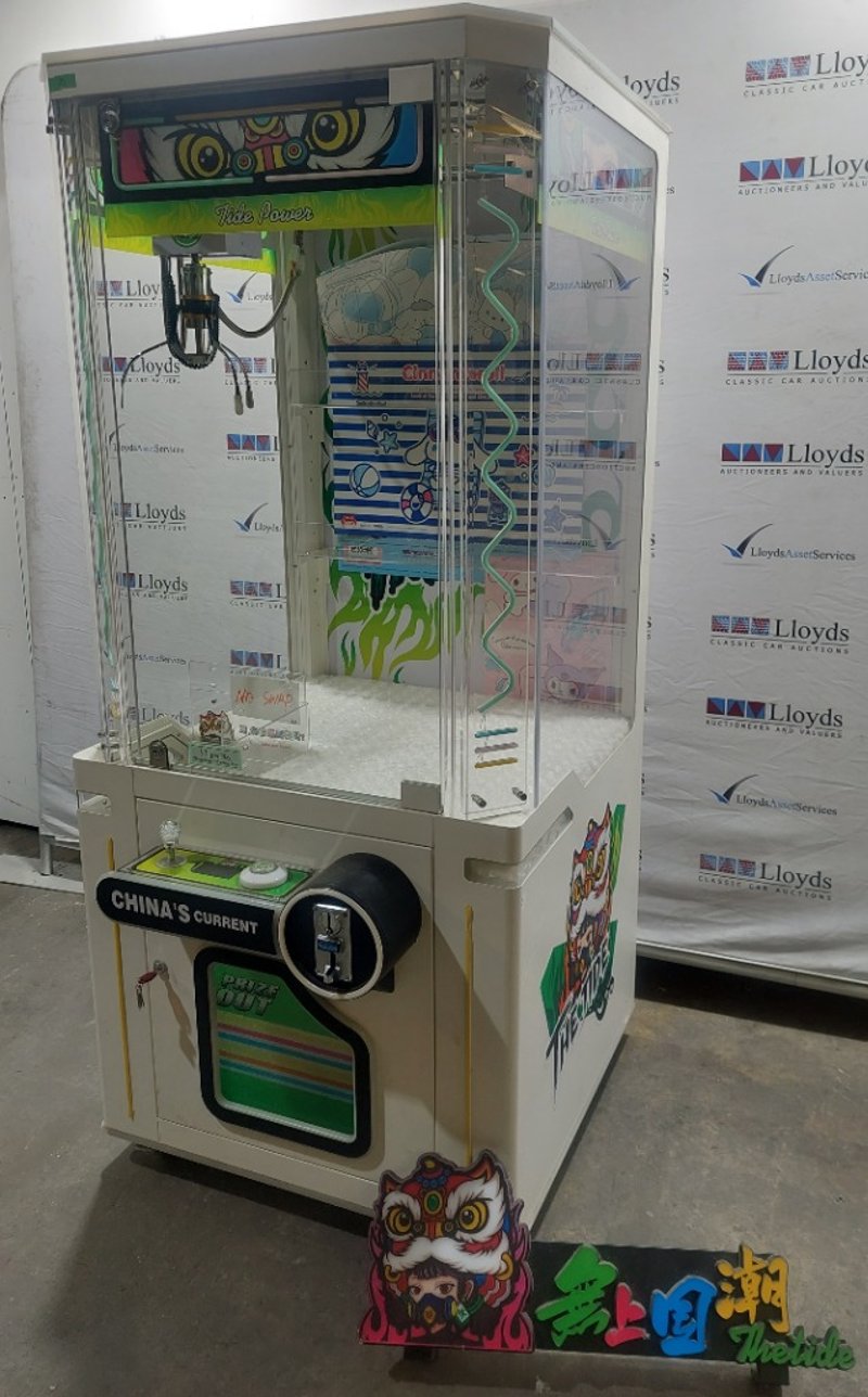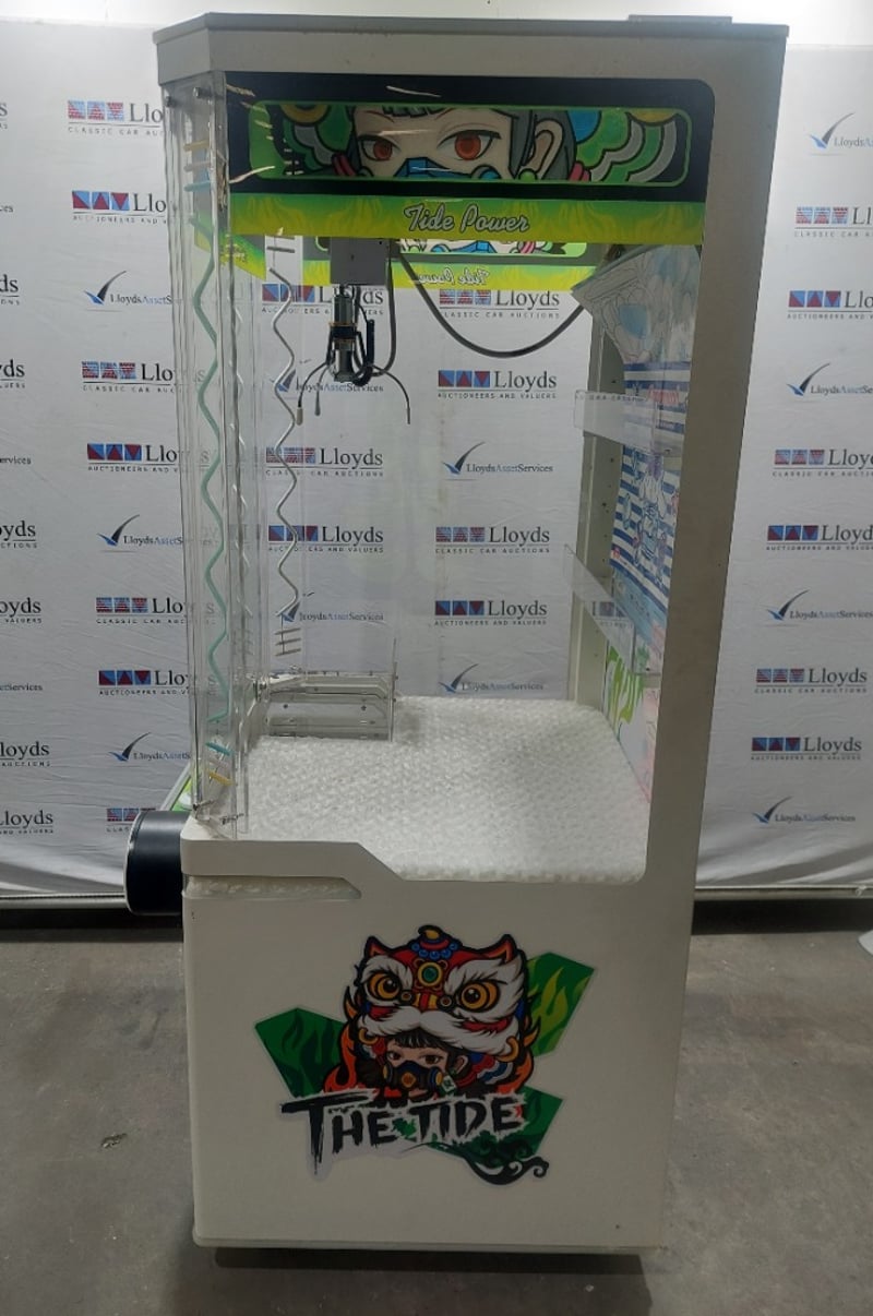 Arcade Claw Machine - The Tide 'Tide Power', single player, green theme, joystick controls, coin operated, mobile.Dims: 1900mm x 800mm x 850mmNote: Item is untested, signs of wear, keys included.