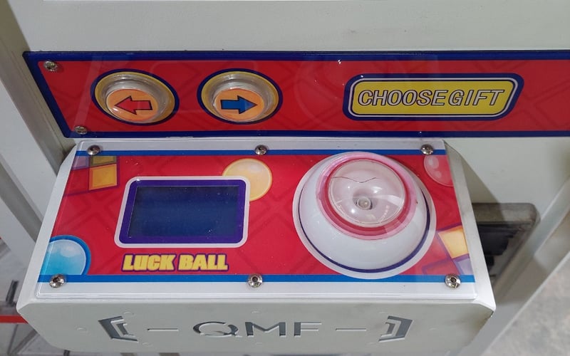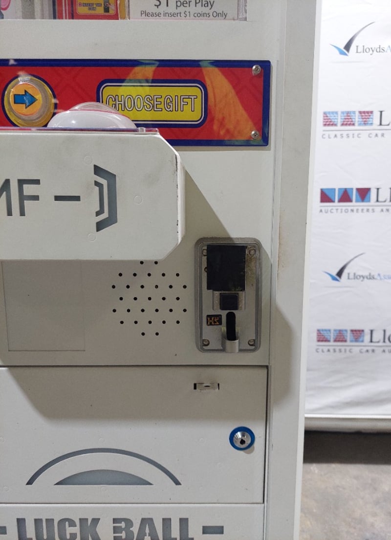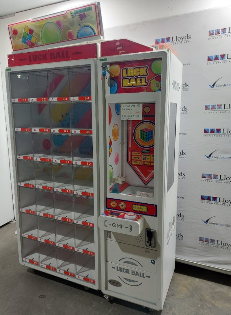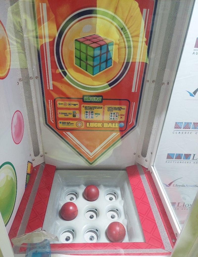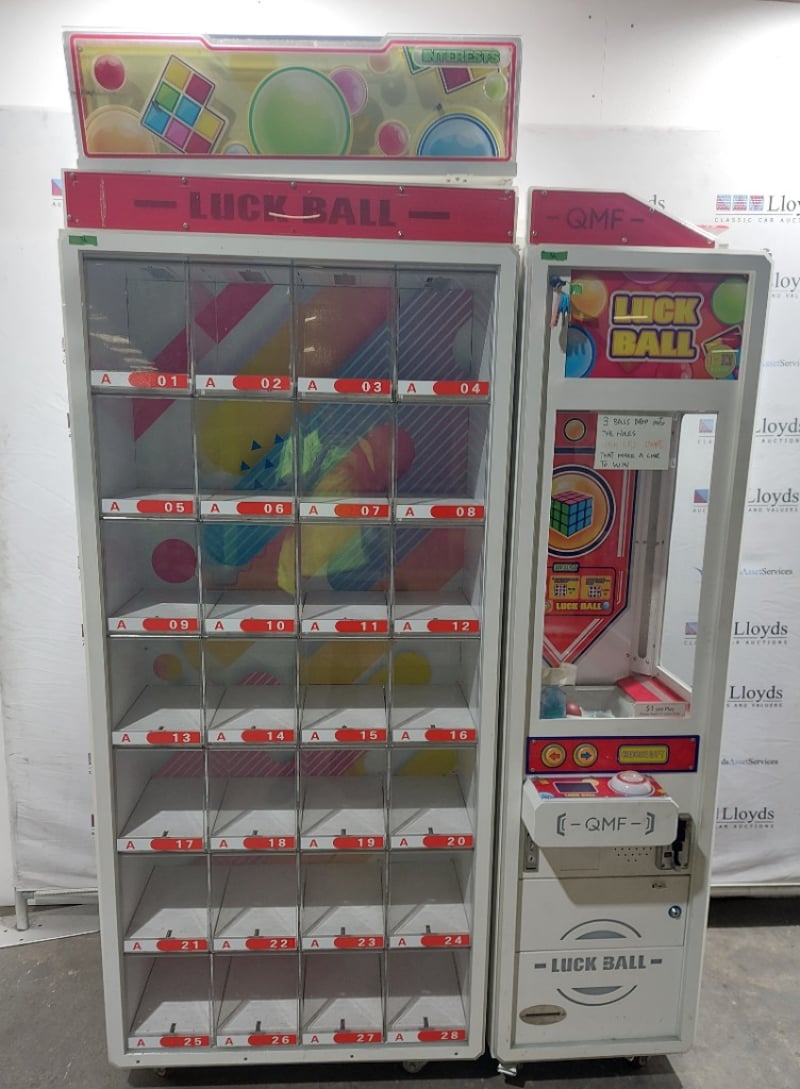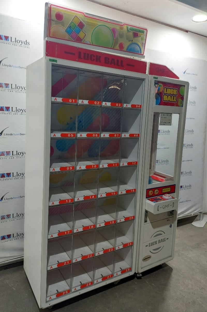 Prize Vending Machine - QMF 'Luck Ball Winner 3.0', single player, button controls, coin operated, 28-gift selection, 9-ball game, mobile. Dims: 1900mm x 1200mm x 850mmNote: Item is untested, with signs of wear, keys included.