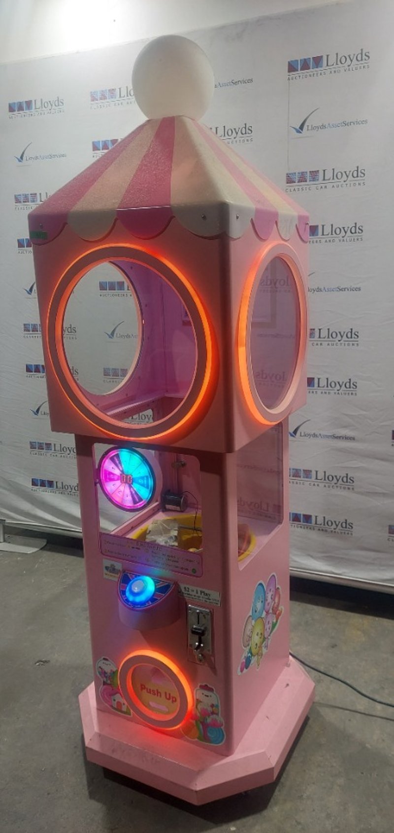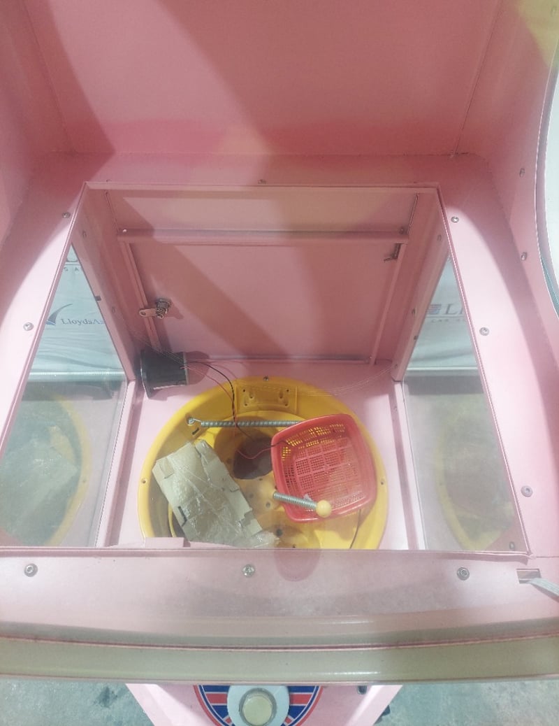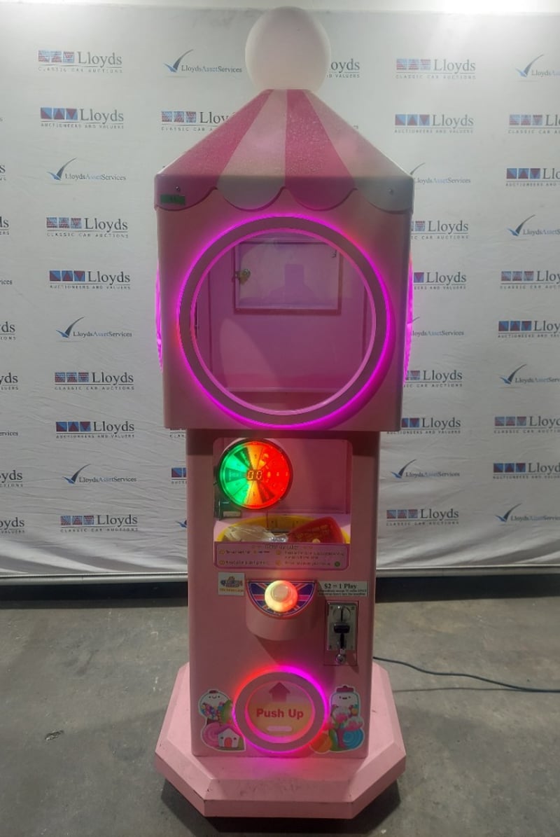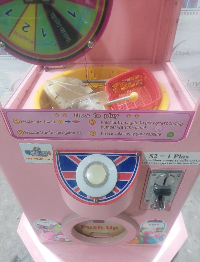 Capsule Toy Vending Machine - Maidoudou XJD-1104, single player, blue theme, button controls, coin operated, mobile.Dims: 1900mm x 650mm x 650mmNote: Item is untested, with signs of wear, keys included.