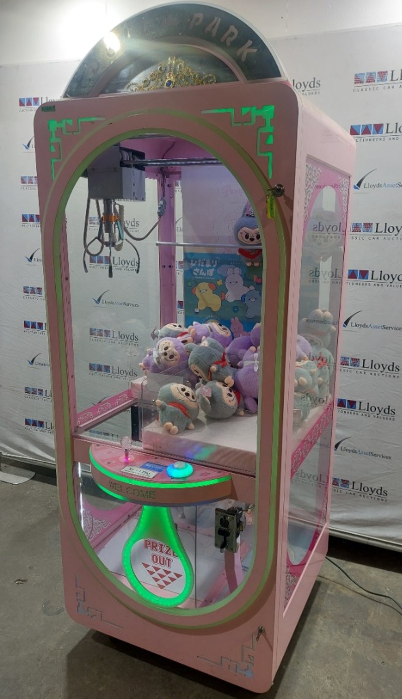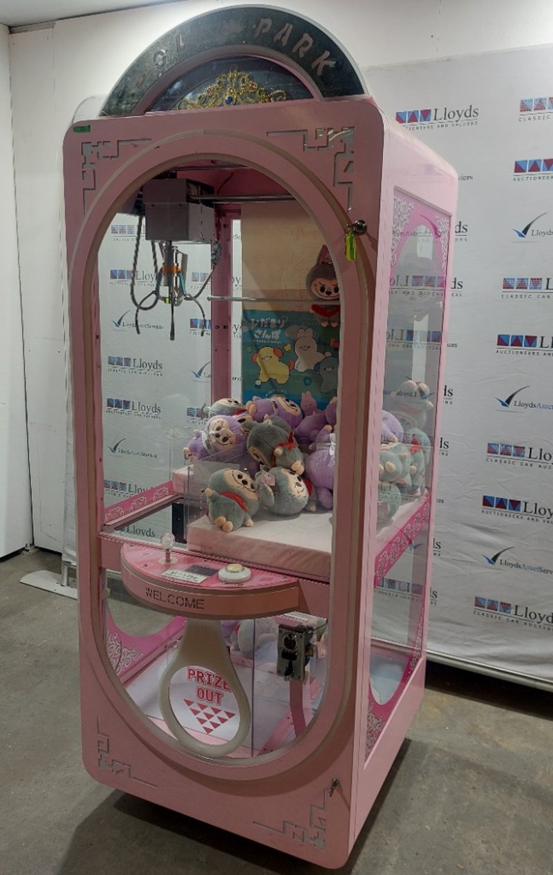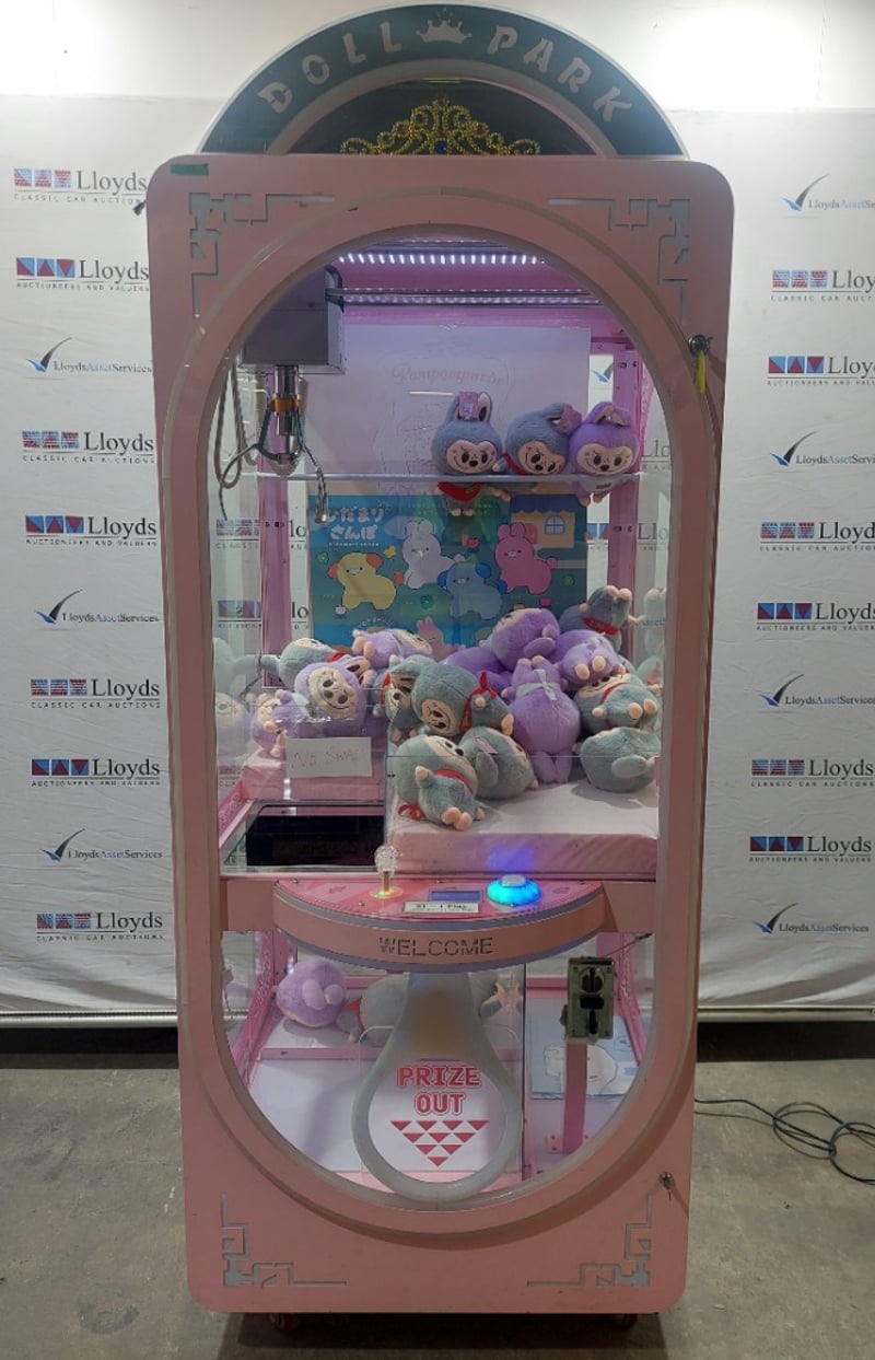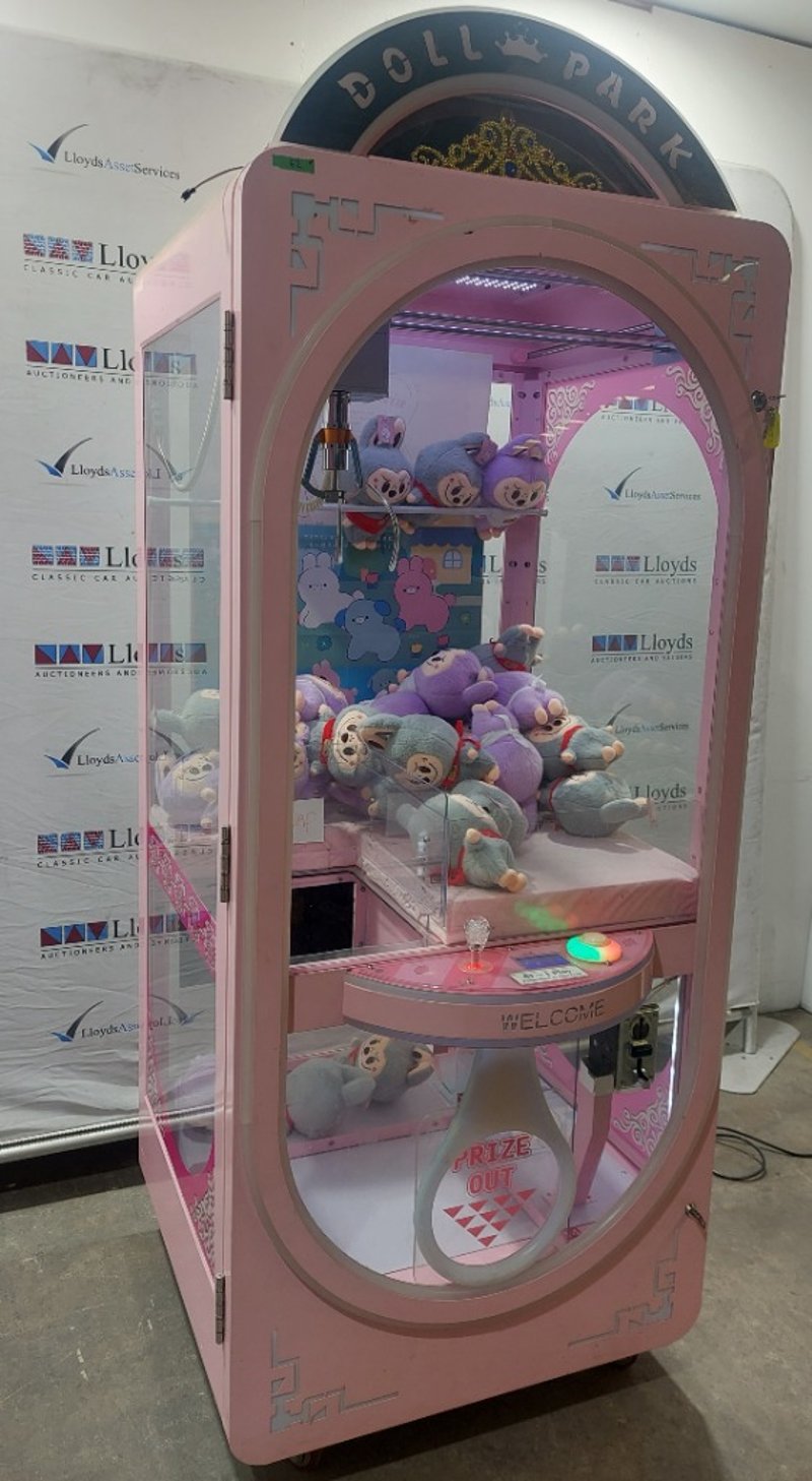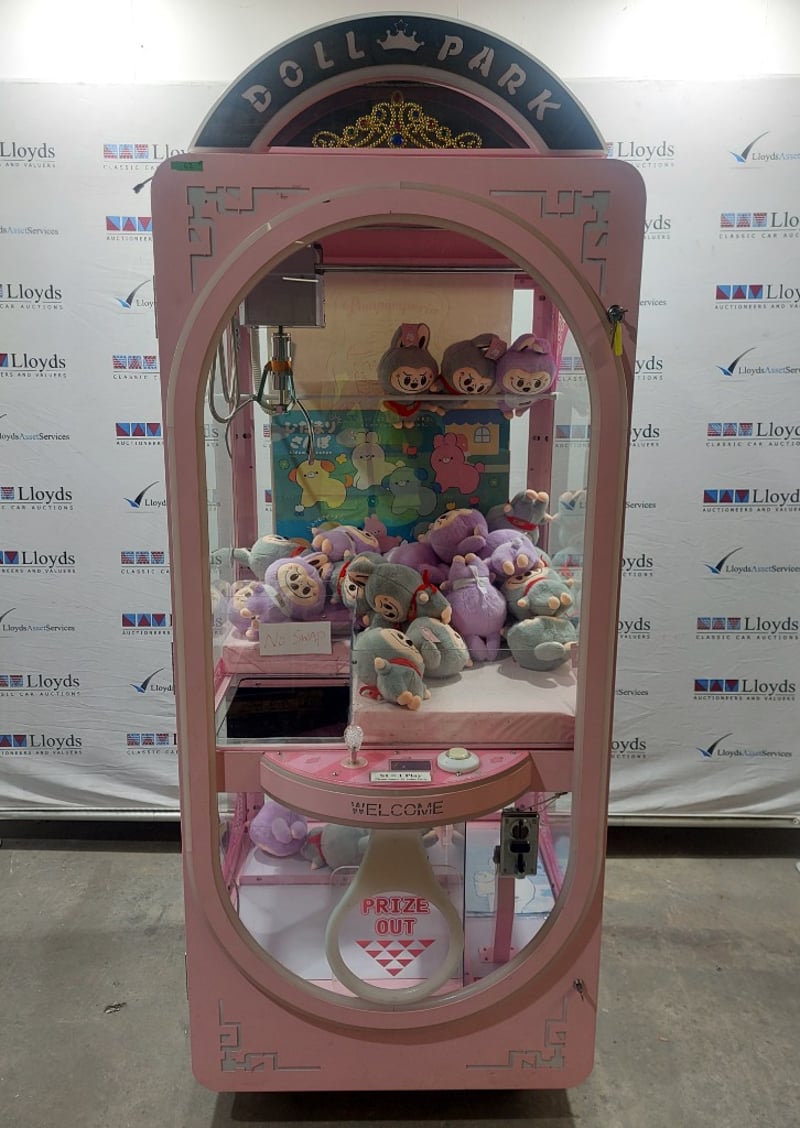 Arcade Claw Machine - Blee 'Doll Park', single player, pink theme, joystick controls, coin operated, mobile.