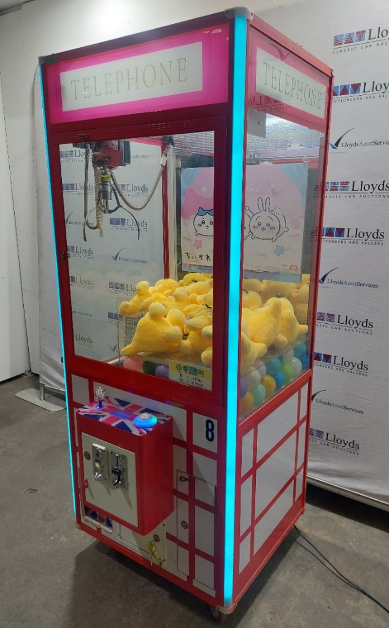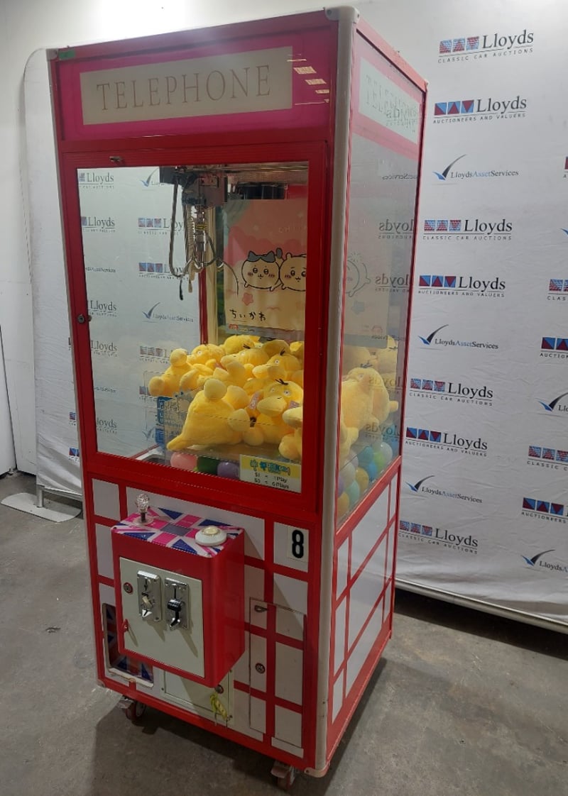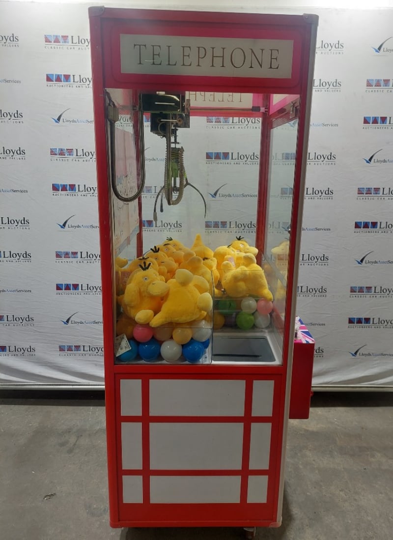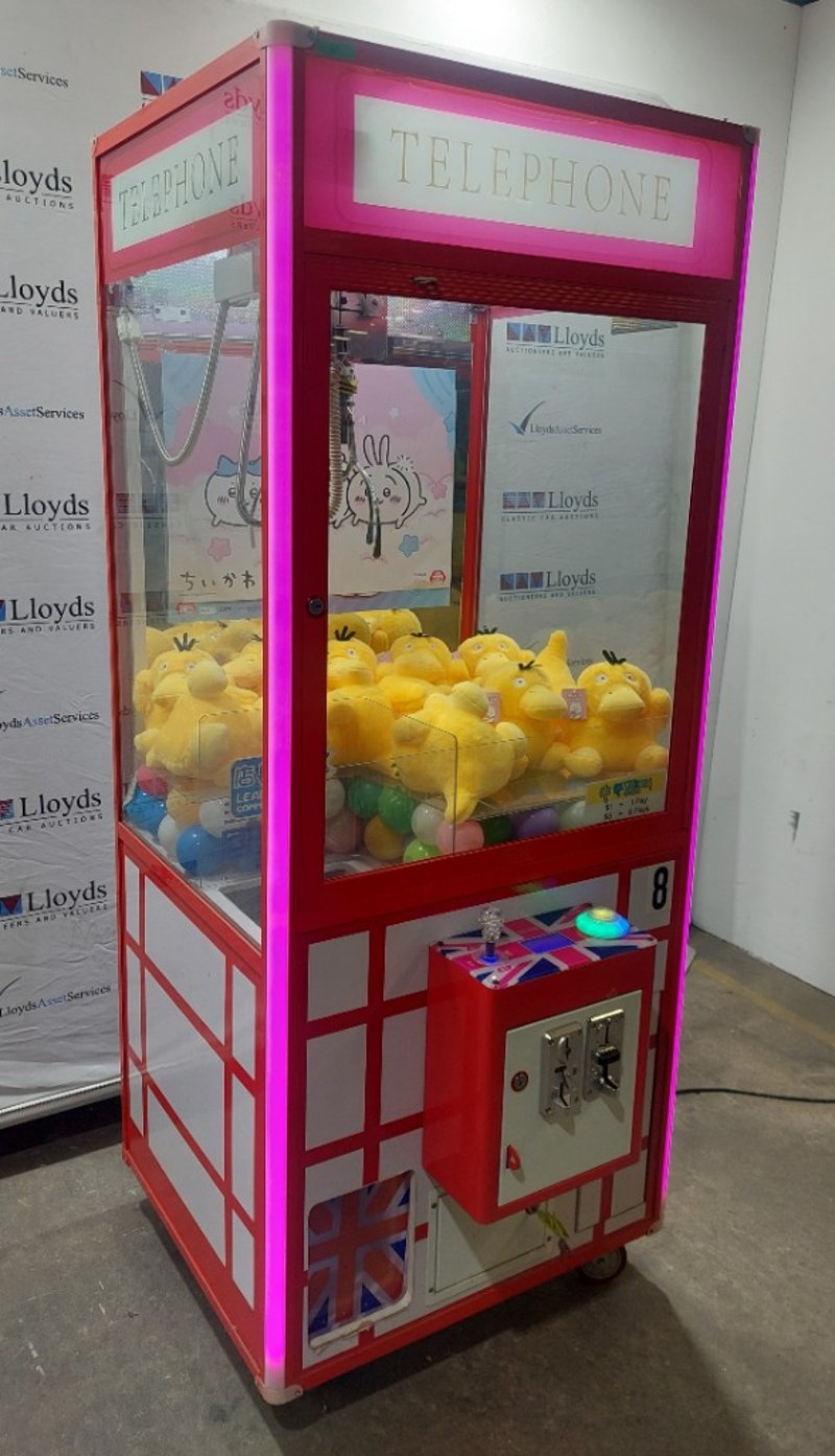 Arcade Claw Machine - Unbranded 'Telephone', single player, British theme, joystick controls, coin operated, mobile. Dims: 2200mm x 800mm x 850mmNote: item is untested, with signs of wear, keys included.