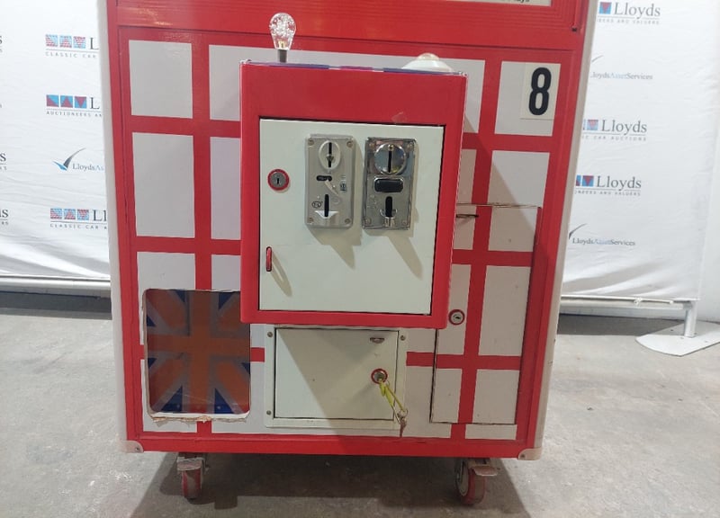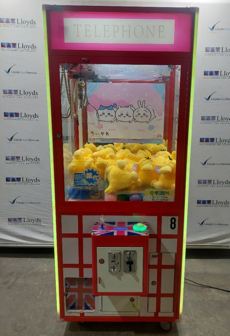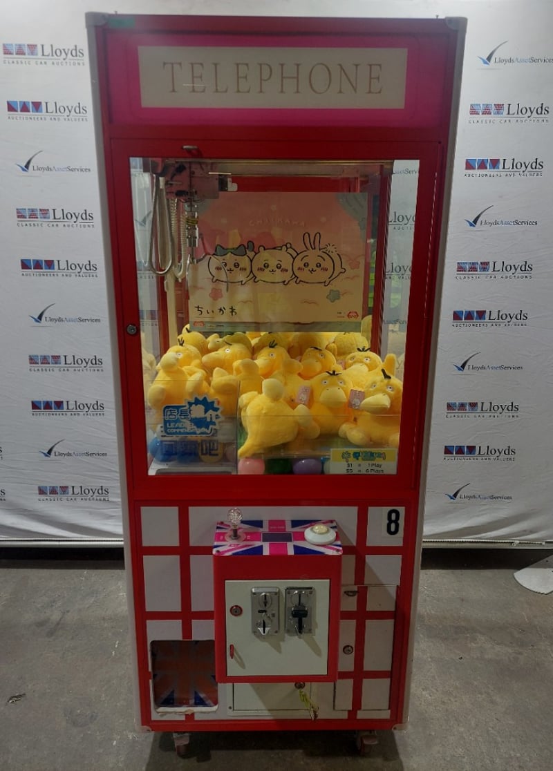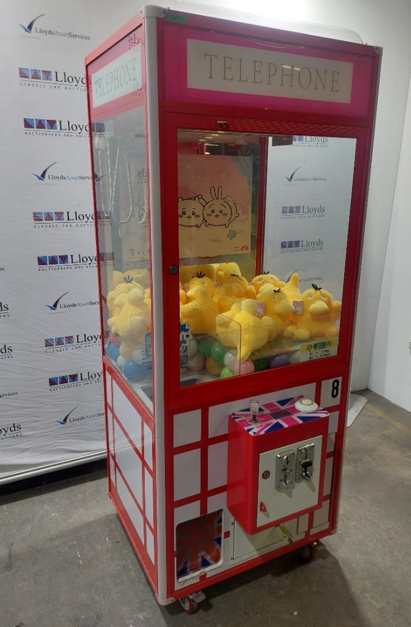 Arcade Claw Machine - Unbranded 'Telephone', single player, British theme, joystick controls, coin operated, mobile. Dims: 2200mm x 800mm x 850mmNote: item is untested, with signs of wear, keys included.