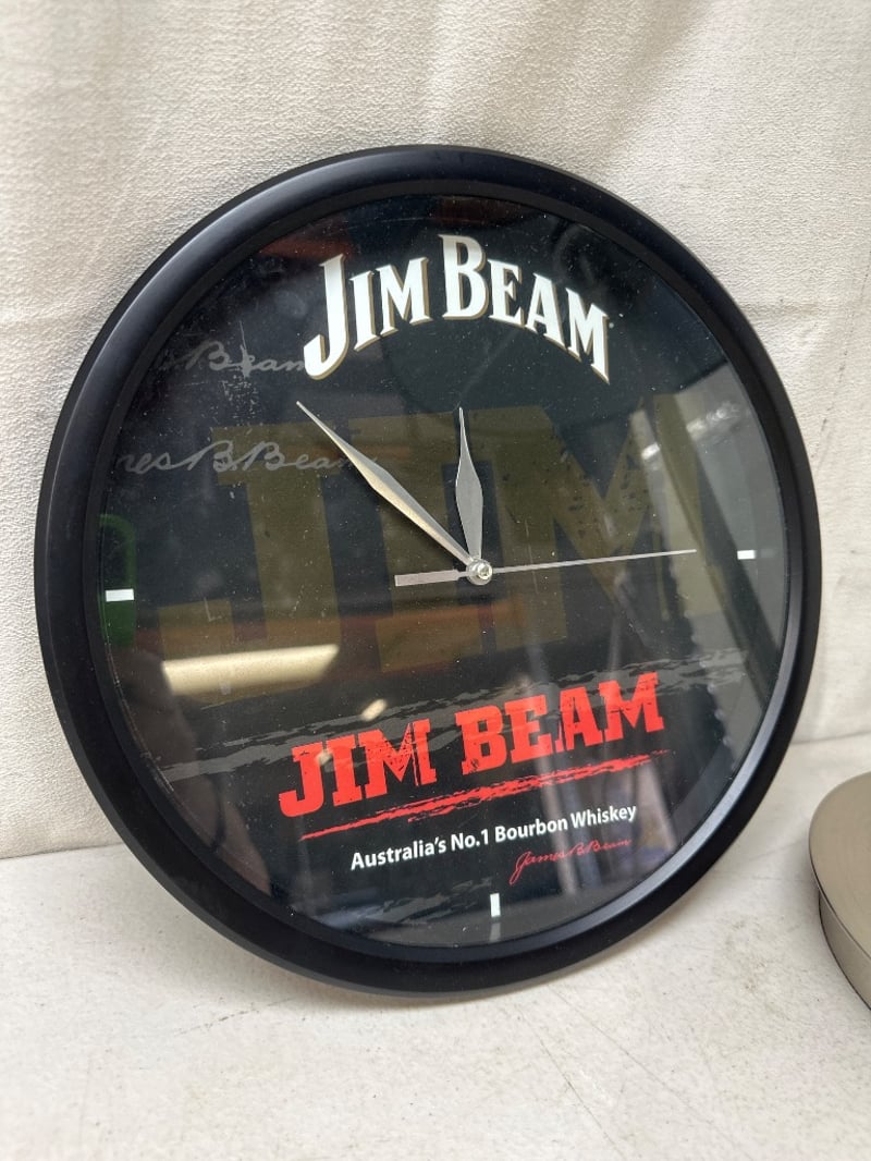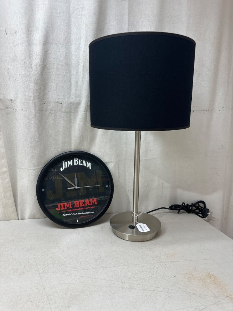 Lamp and ClockBlack and silver lampJim beam clockSold as lot