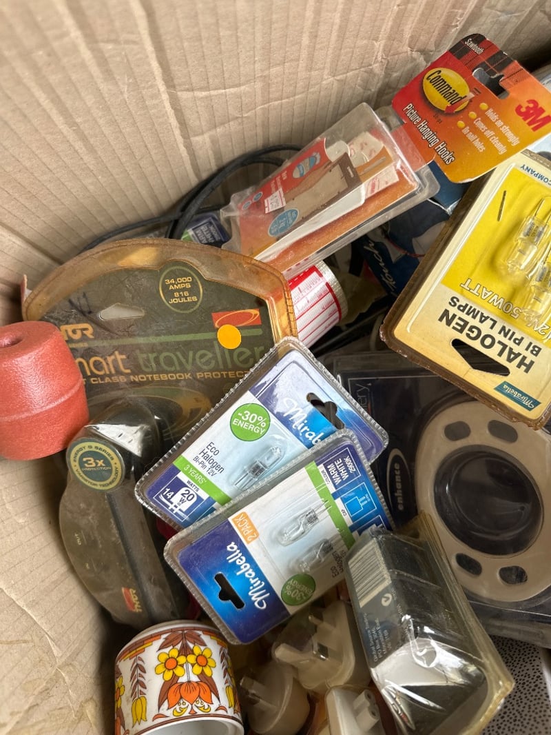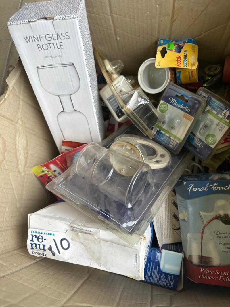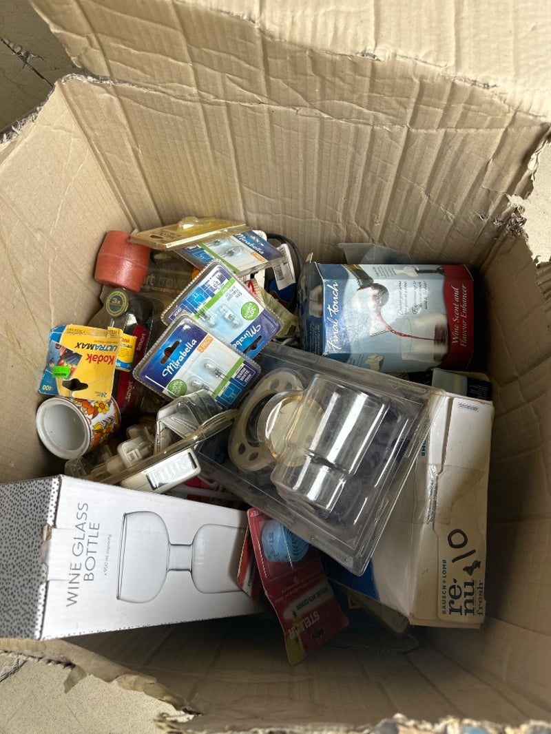 Assorted box lotWine dispensers, renu solution, bulbs, batteries etcSold as lot