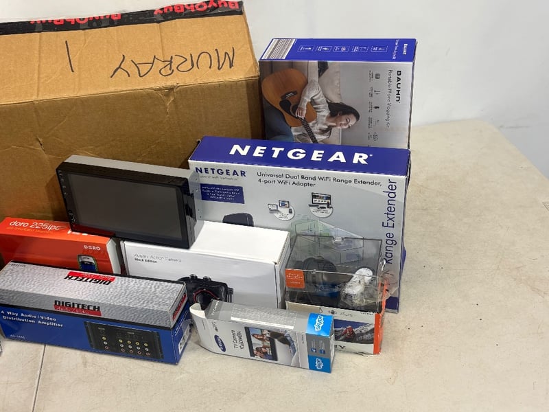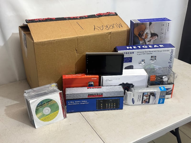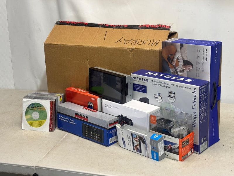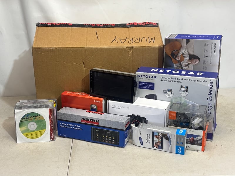 Assorted Lot of Electronic Goods and Media; Including: Action Cameras, Audio Distribution Amplifier, Broadband Telephone, Universal Dual Band Wifi Extender and more