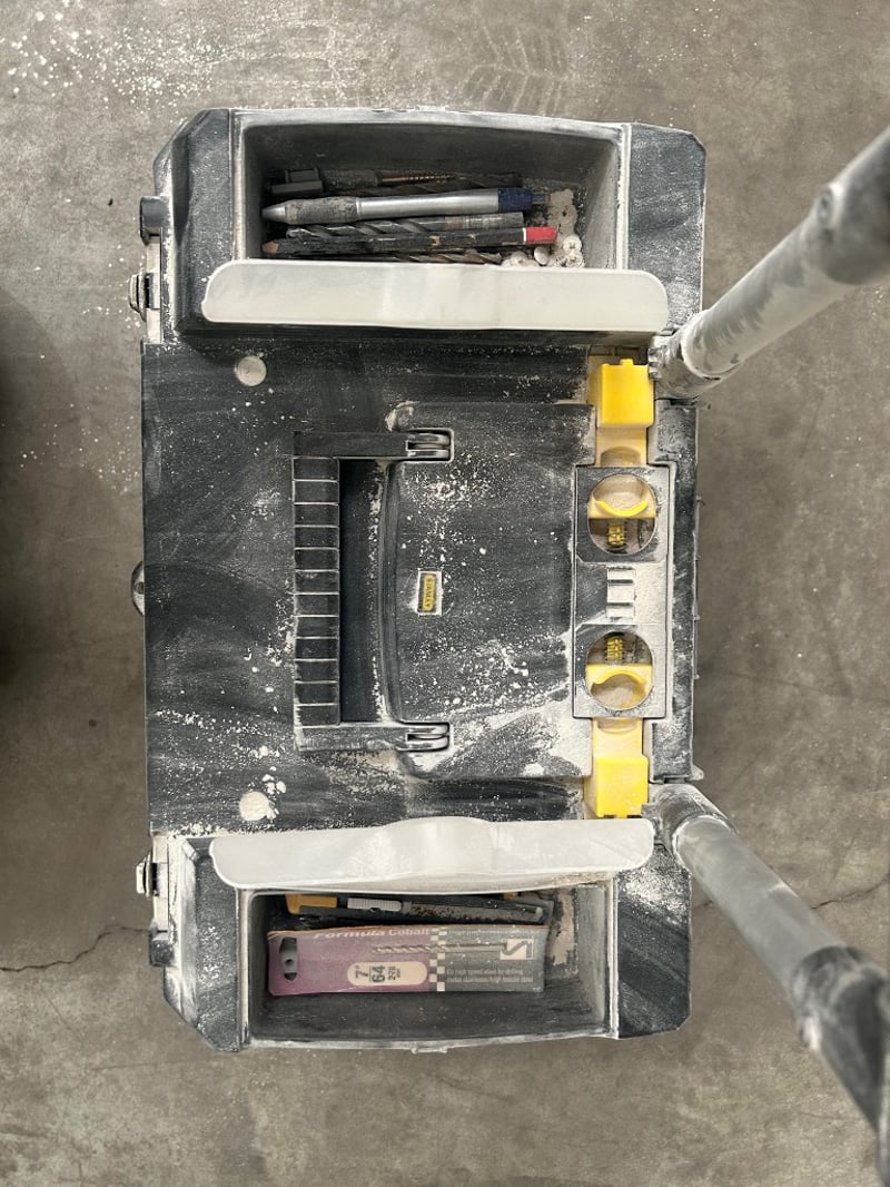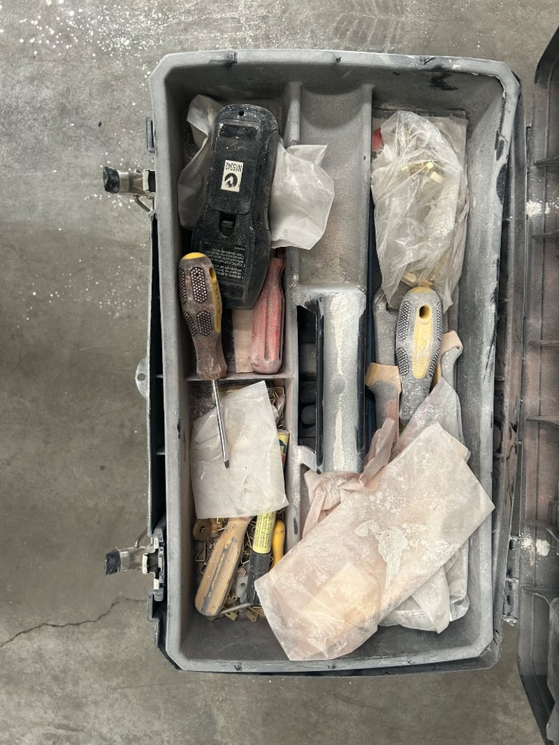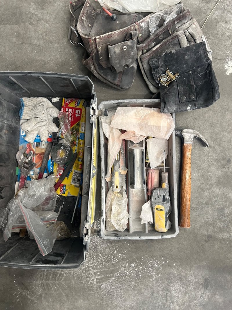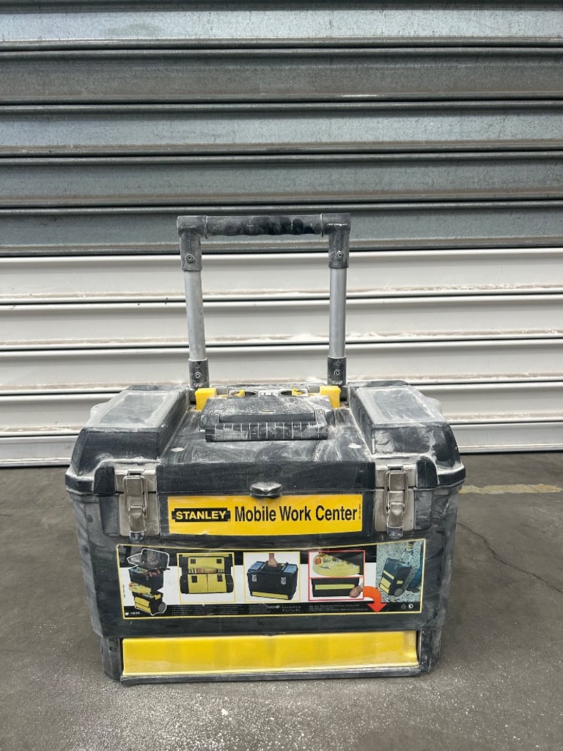 Stanley Mobile Work Center rolling toolbox, assorted lots includes, hand tools, screwdrivers, chisels, hammer, bits, fasteners, tool belts/pouches Sold as lot