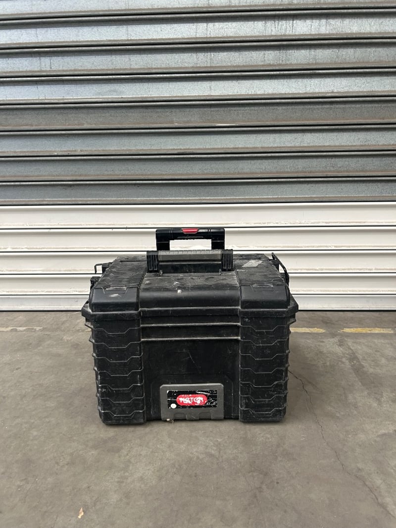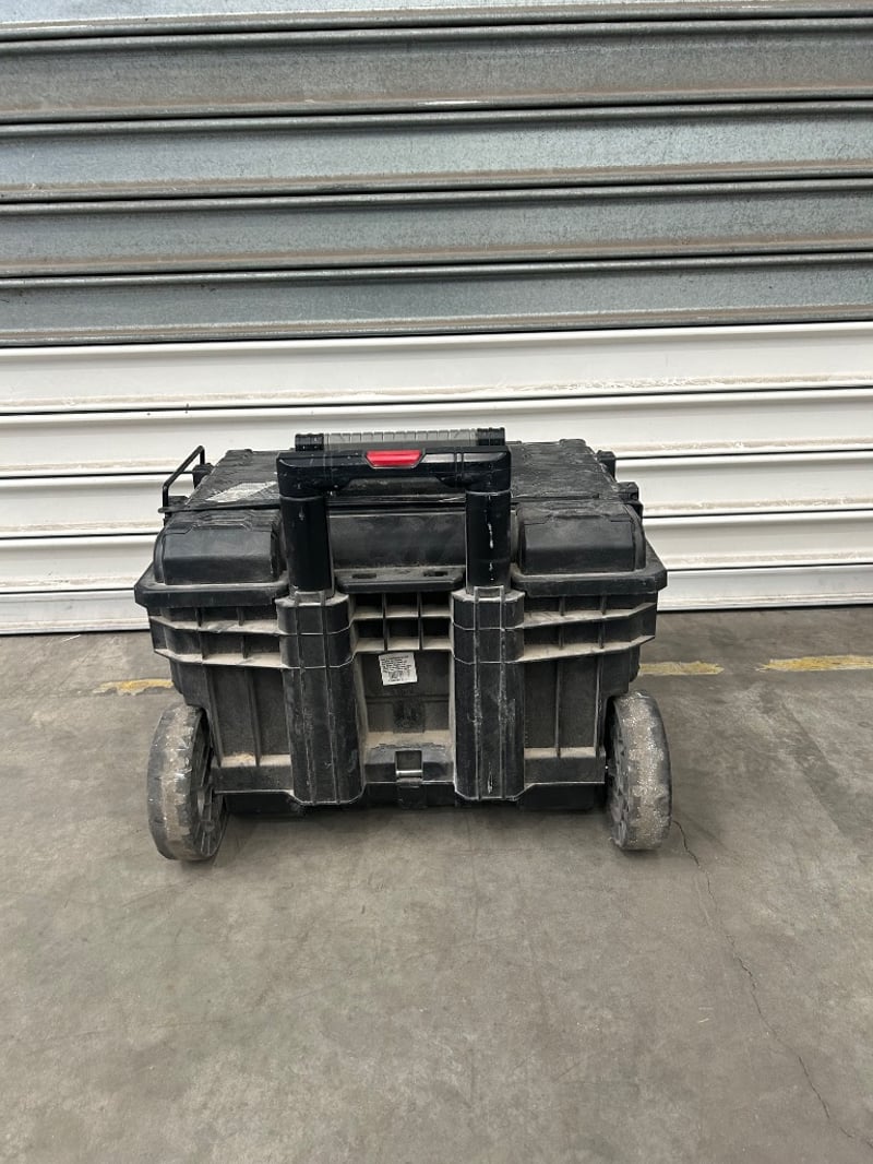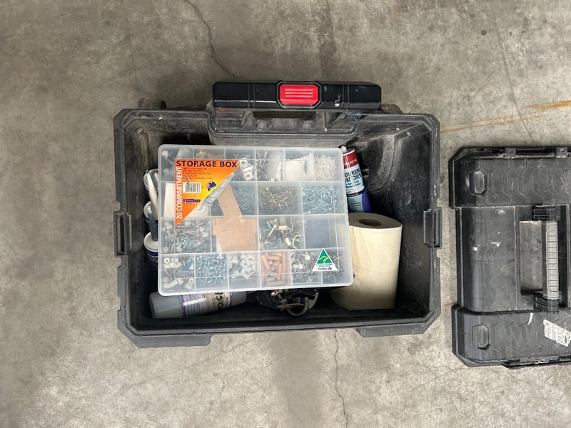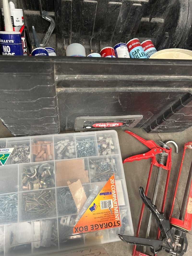 Tool box on wheels with extendable handle, sealants/adhesives, caulking guns, fixings, screws, anchors Sold as lot