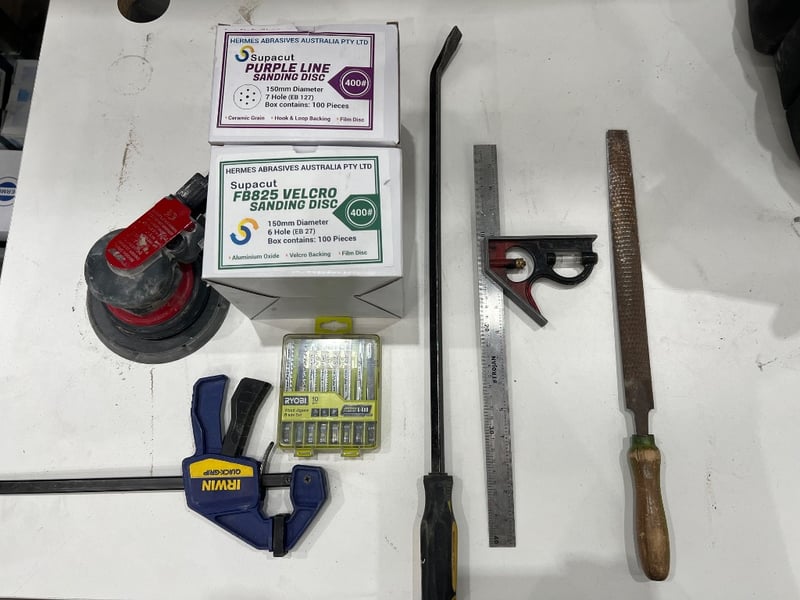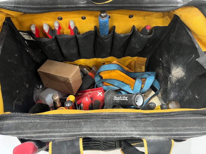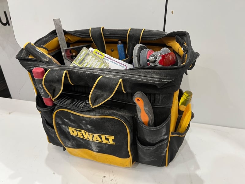 Assorted tools, includes; wood rasp, grinder, sanding discs, DeWALT tool bag and more, brands include; Ryobi, supacut, Trojan and more Sold as lot
