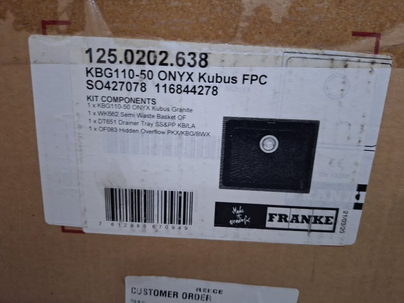 Franke, Onyx Sink, Kubus Granite, Includes Semi Waste Basket, Drainer Tray, Hidden Overflow, Approximately 200mm (H) x 540mm (W) x 420mm (D)