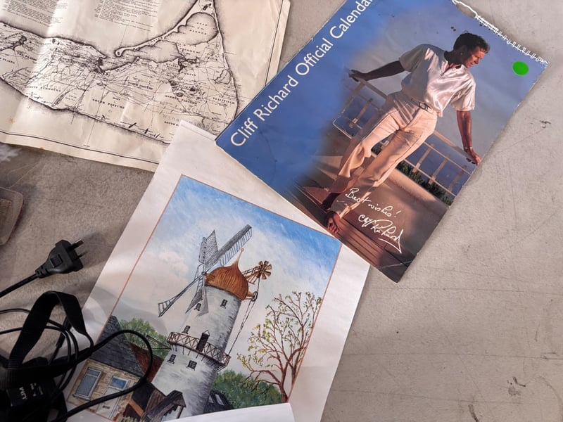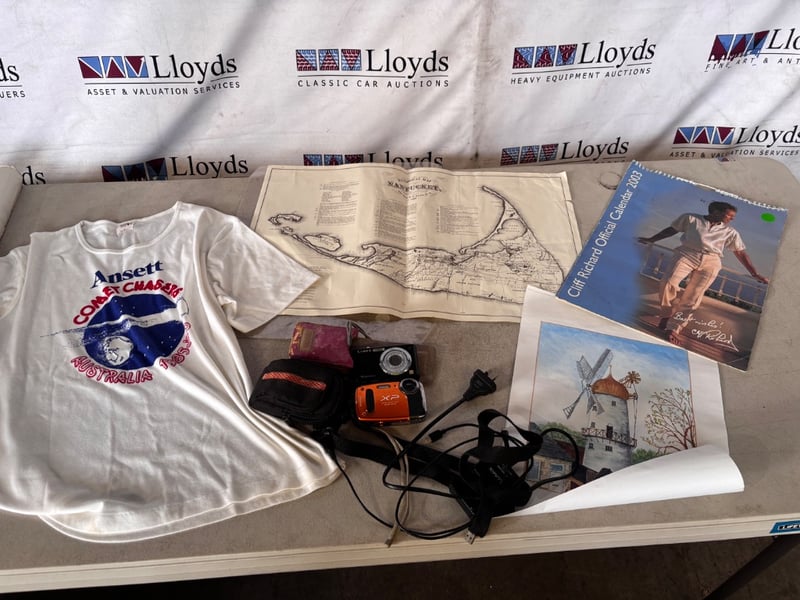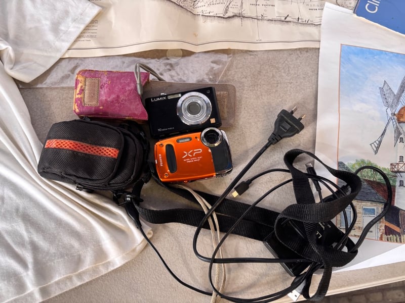 Assorted box lot Containing digital cameras, ancient map poster and cords.