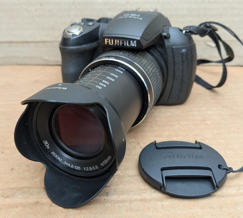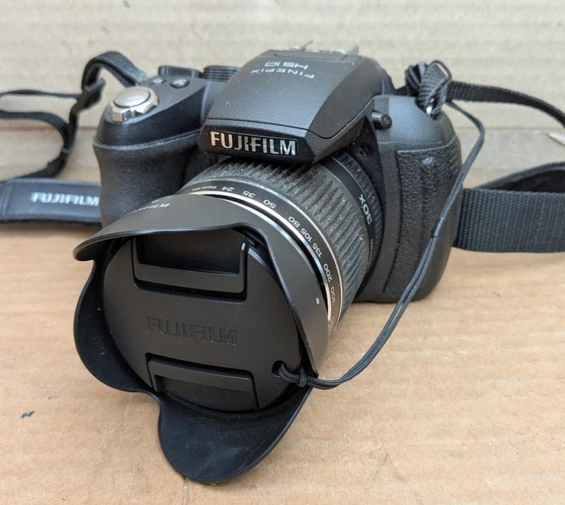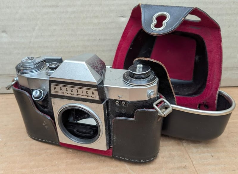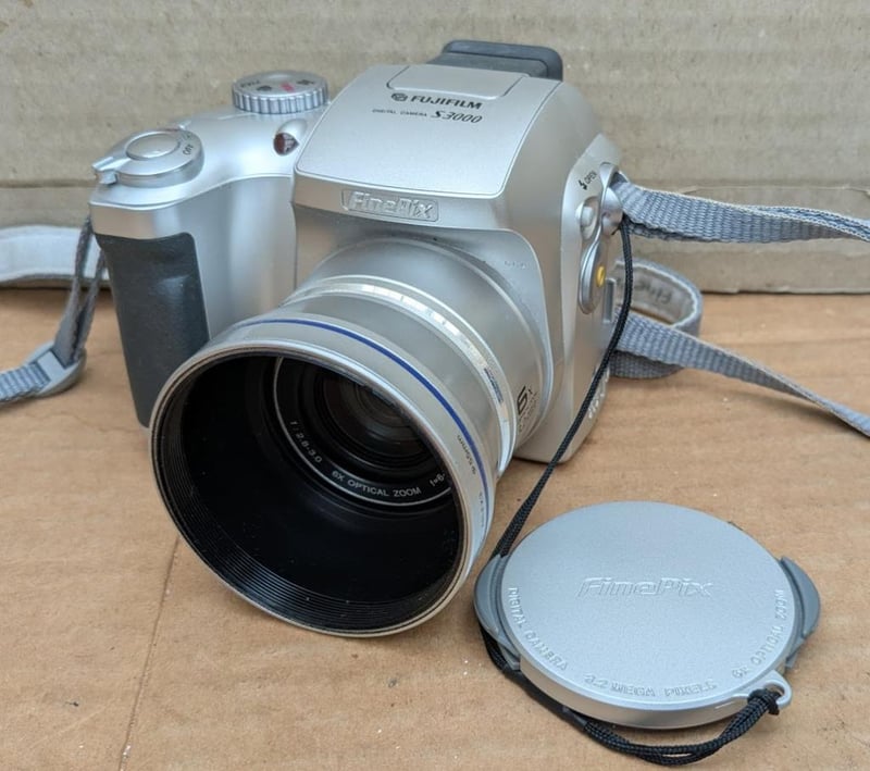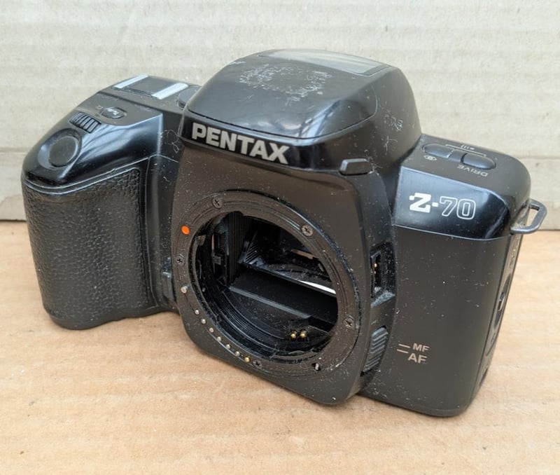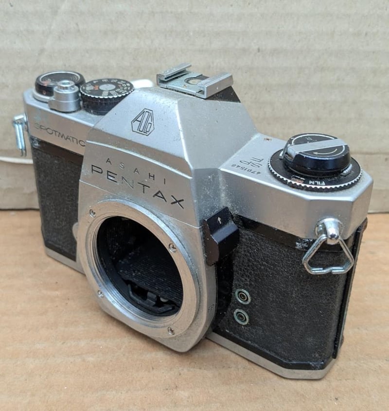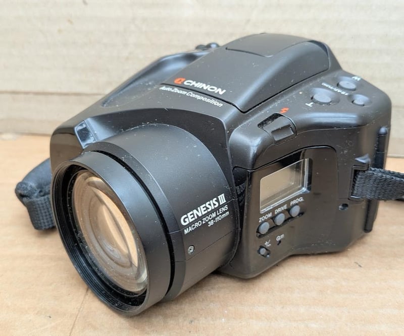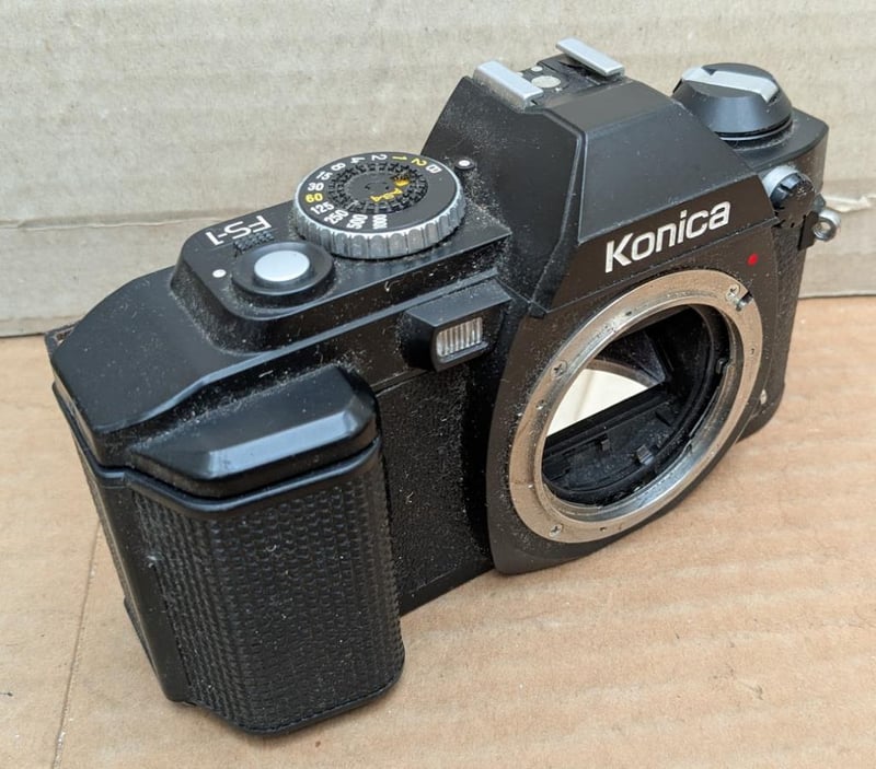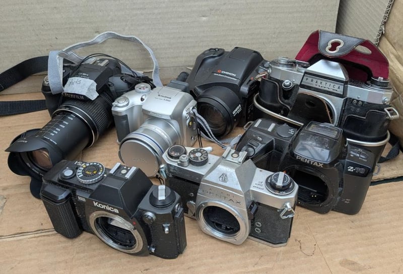 Box lot 7 Digital and film cameras for parts or DIY repair include Chinon, Konica, Pentax, Fujifilm & Praktica