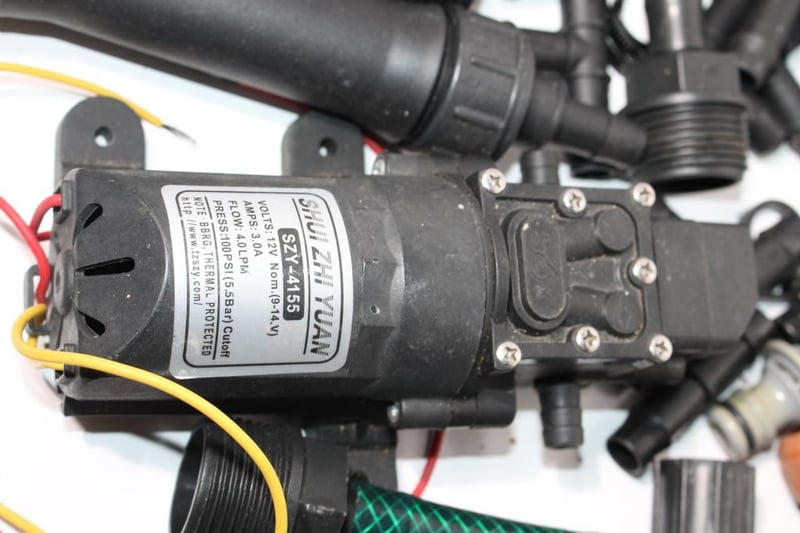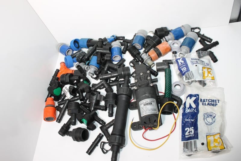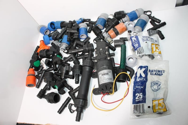 Irrigation Fittings Lot with 12V Water Pump and Hose AccessoriesMixed lot of irrigation and hose fittings including taps, connectors, clamps and adaptors.Includes Shui Zhi Yuan SZY-4155 12V water pump (40 LPM, 100 PSI) and K-Rain clamps, sold as one lot.