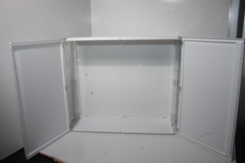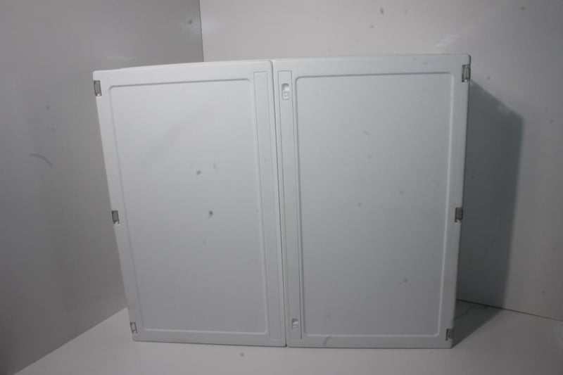 White Plastic Double-Door Storage CabinetWhite plastic cabinet with two hinged doors and internal storage compartment.No visible branding or model number; light surface marks visible in photos, contents empty.